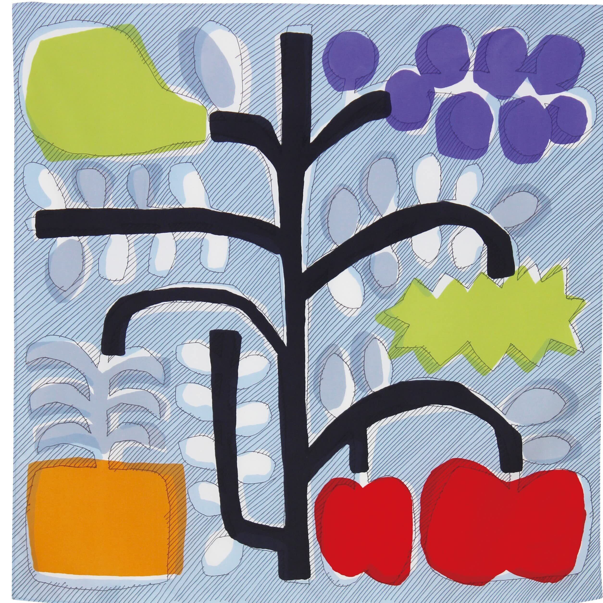 一本の木にいろいろなフルーツが実っている様子が描かれた風呂敷は、包む方向によって違った色の出方を楽しめる。