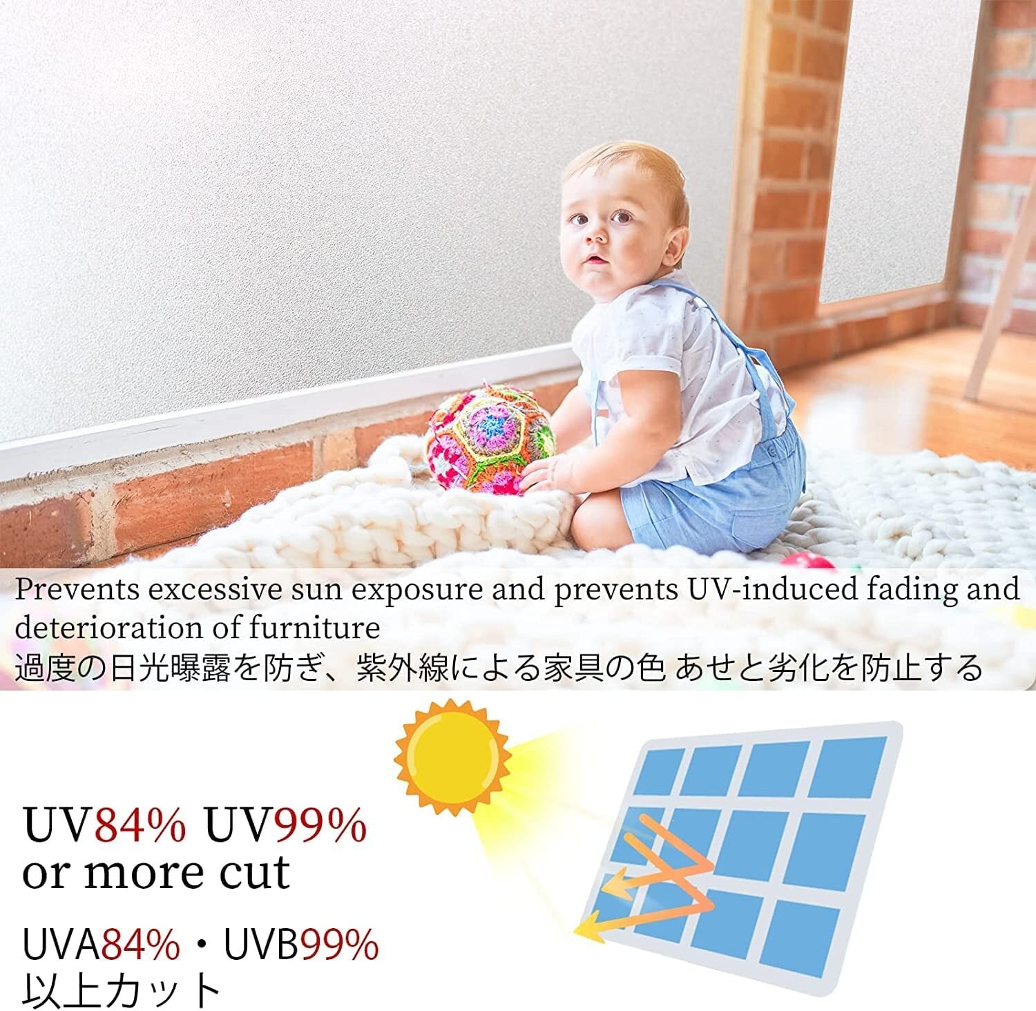 【目隠し・日射調整・UVカット】⇒ 窓ガラス 目隠しシート 断熱 ガラスを通して入る大量有害な紫外線をカットします。UVA 84%・UVB99% 以上カットし、日光を和らげ、内装を保護します、 紫外線による家具や床材の変色を守ります。フローリングや畳、カーペットなどの床材、インテリア・家具の紫外線による日焼け、劣化を防止します。そして、地震や台風などでガラスが割れても破片が飛び散りにくく、二次災害の発生を防ぐのにすこし役立ちます。窓がらすフィルム 室内の明るさを保ちつつ、眩しい日射を和らげられるので、昼のパソコン仕事、読書や勉強なども楽になり、目も疲れにくくなります。日差しのきつい夏にも明るさが貴重な冬にも重宝!
