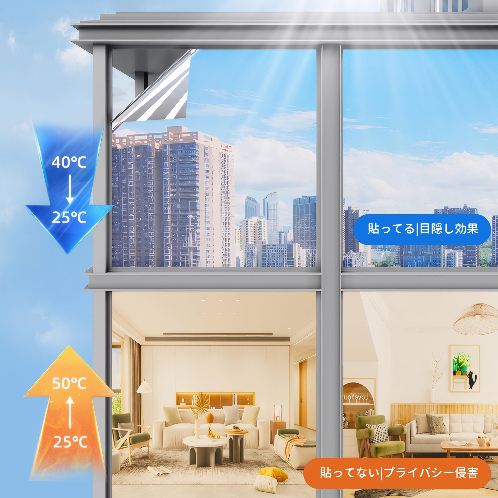 【両面ミラー効果&自然な採光】:昼間は外側から見ると鏡のように反射し、室内が見えにくい仕様。一方、内側からは透明感を保ち、自然光をたっぷり取り込めるので、暗くなりすぎず明るい空間をキープします。浴室やリビングの窓など、さまざまな場所に最適です。