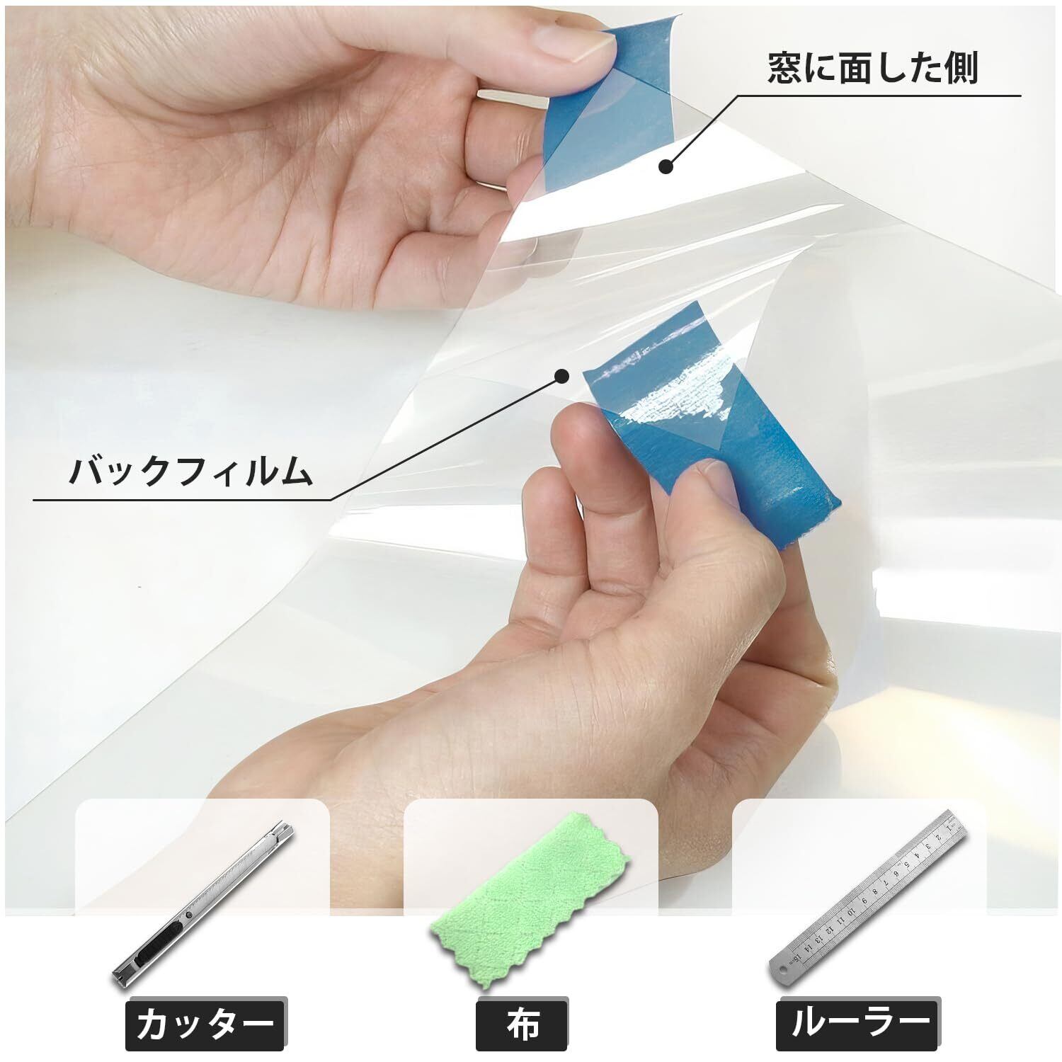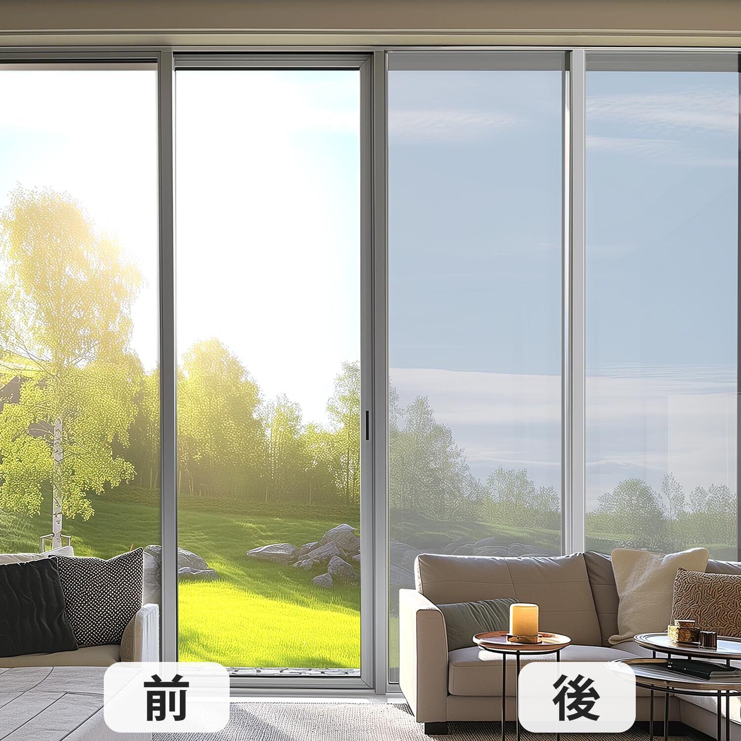 ガラス破片の飛散防止と簡単な貼り付け: ミラーフィルムは静電気吸着タイプで、粘着剤を使用せず水だけで簡単に貼り付けられます。台風や地震などでガラスが割れても、破片の飛散を防ぎ、二次災害や思わぬ怪我を予防します。初心者でも簡単に貼れて、剥がした後も跡が残りません。