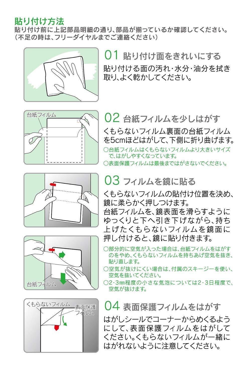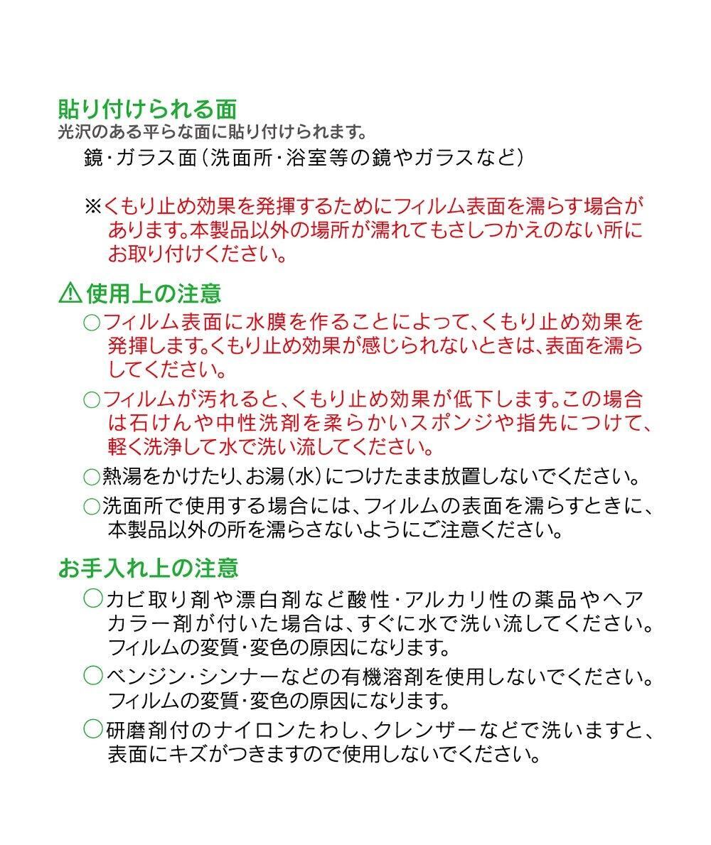 ●洗面所・浴室の湯気の中でもくもりません。 ●くもり止め効果は約1年ですが、湿度や汚れの多い所では早く効果がなくなることがあります。 ●フィルム表面に水膜を作ることによって、くもり止め効果を発揮します。くもり止め効果を感じられないときは、表面を濡らしてください。 ●簡単にキレイに貼れるシリコーン粘着タイプのくもらないフィルムです。剥がし跡も残りません。 ●フィルムが汚れると、くもり止め効果が低下します。この場合は石鹸や中性洗剤を柔らかいスポンジや指先につけて、軽く洗浄して水で洗い流してください。
