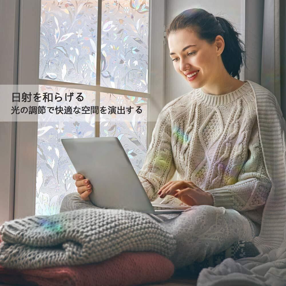【美しい虹色の輝き・おしゃれな花柄】窓フィルム本体は無色ですが、光に当たると、ステンドグラスフィルムになります。虹色の輝きを放して、部屋に映ってとても綺麗です。光の加減で色の強弱が違います。光に直射される所に使うのはおすすめします。立体感あふれ、低コストで地味なガラスをステンドグラス風に瞬間変身!お店、展示棚など目隠しと魅力が必要な場所にもおすすめです。