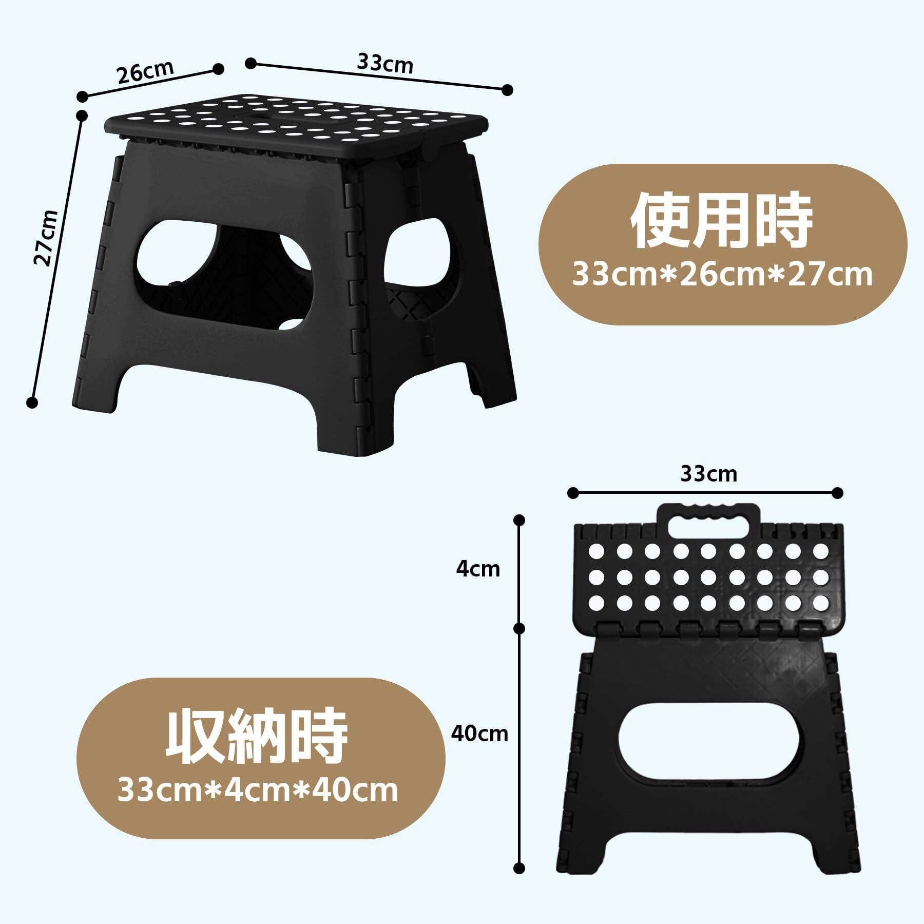 【商品仕様】本体サイズでは折り畳み状態が幅約33cm*奥行約40cm*高さ約4cmです。座面サイズが横29x縦22cmで、使用状態サイズが幅約33cm*奥行約26cm*高さ約27cmです。"