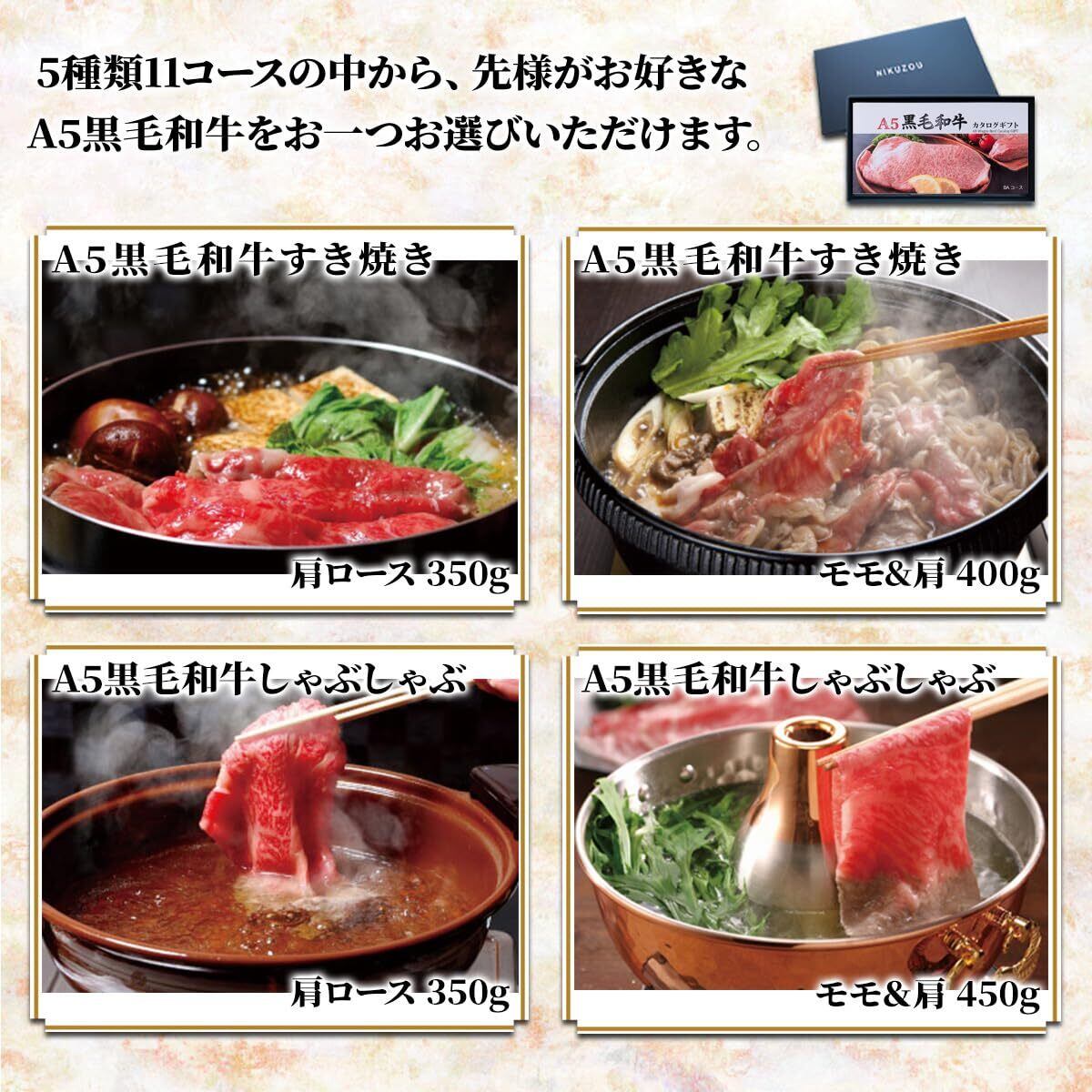 コース種類:すき焼き肉・しゃぶしゃぶ肉・焼肉・ステーキ・希少部位 5コース11商品の中からお好きなA5ランクの黒毛和牛を1つお選びいただけます。