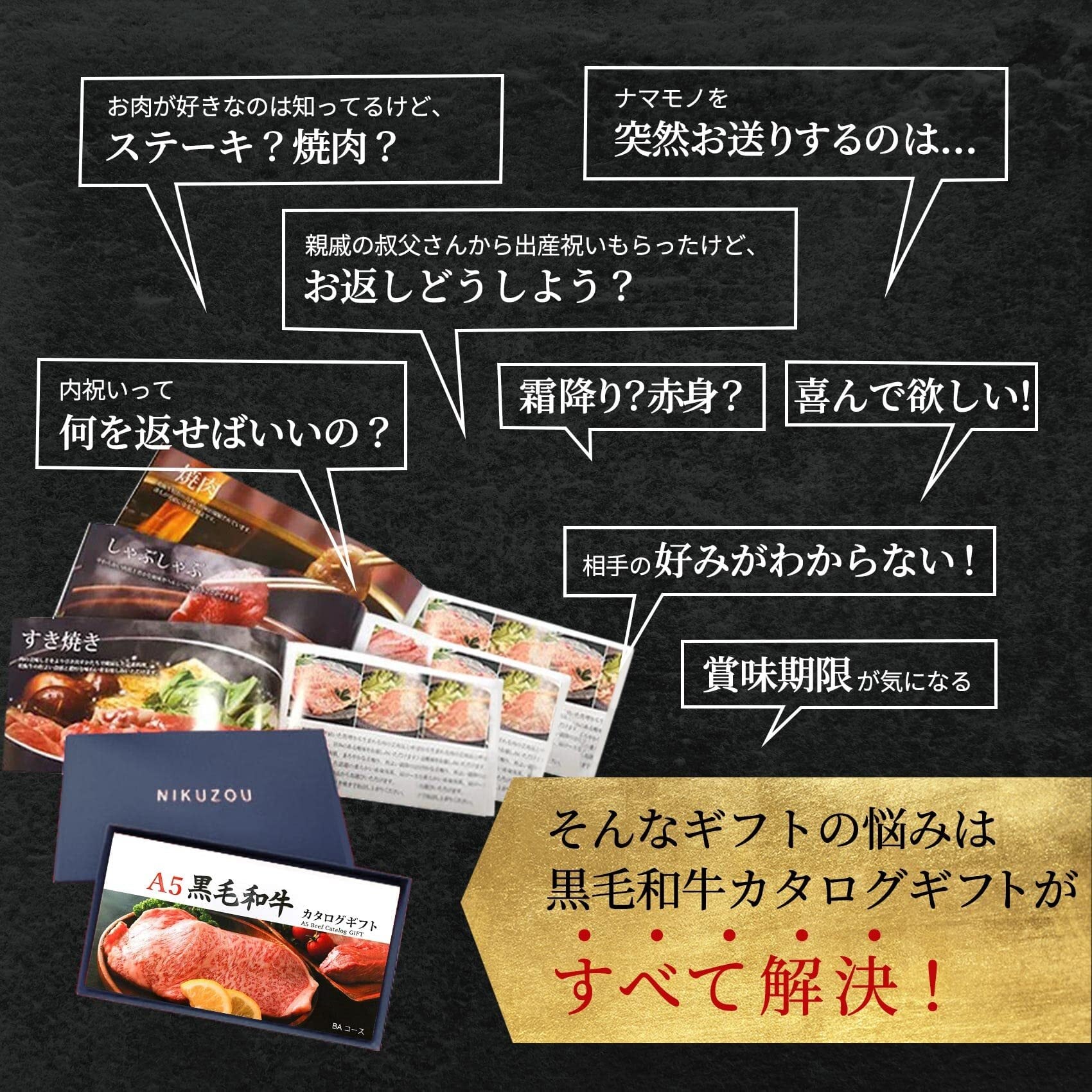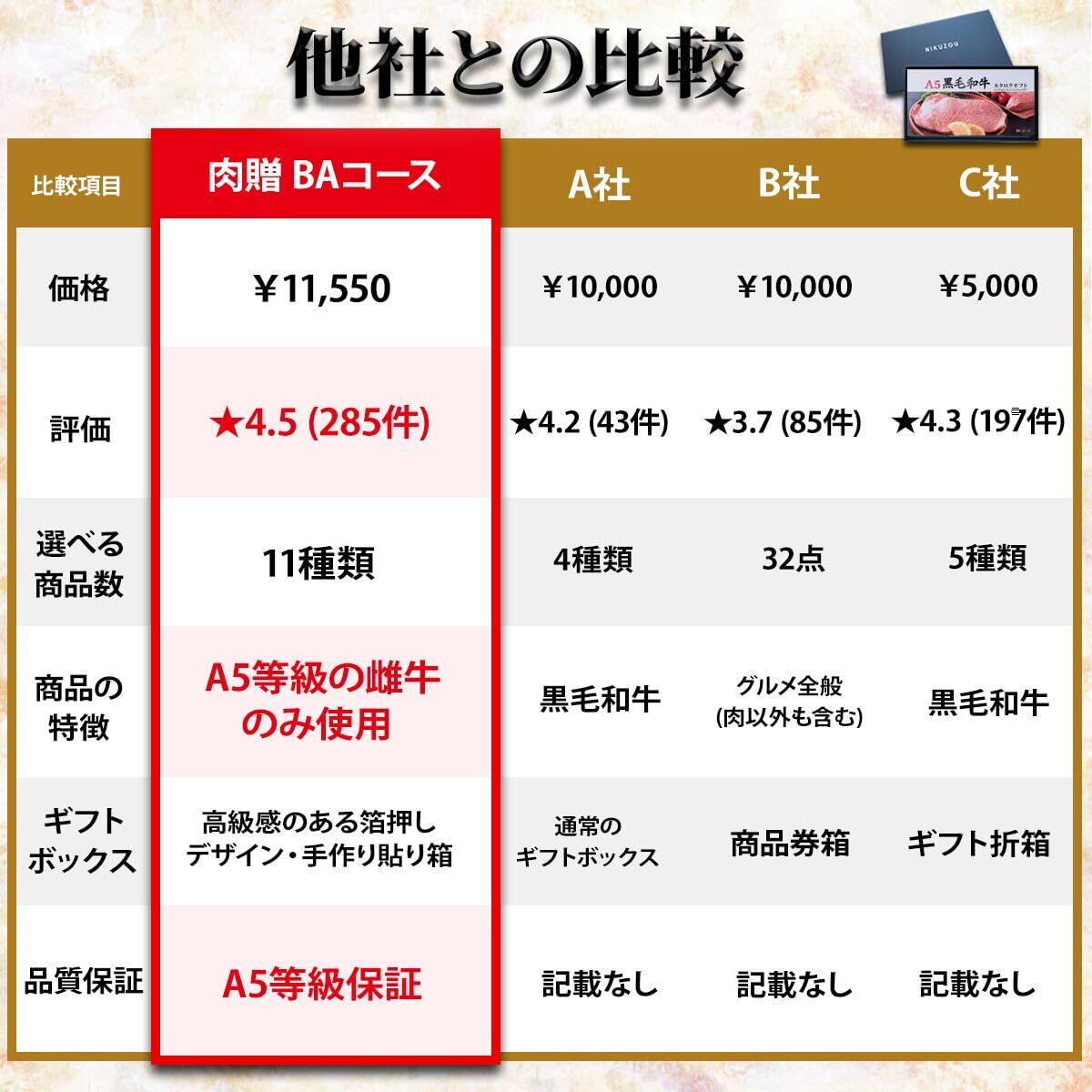 商品詳細:5コース11種類の中からお好きなA5黒毛和牛をお選びいただけるお肉のカタログギフトです。