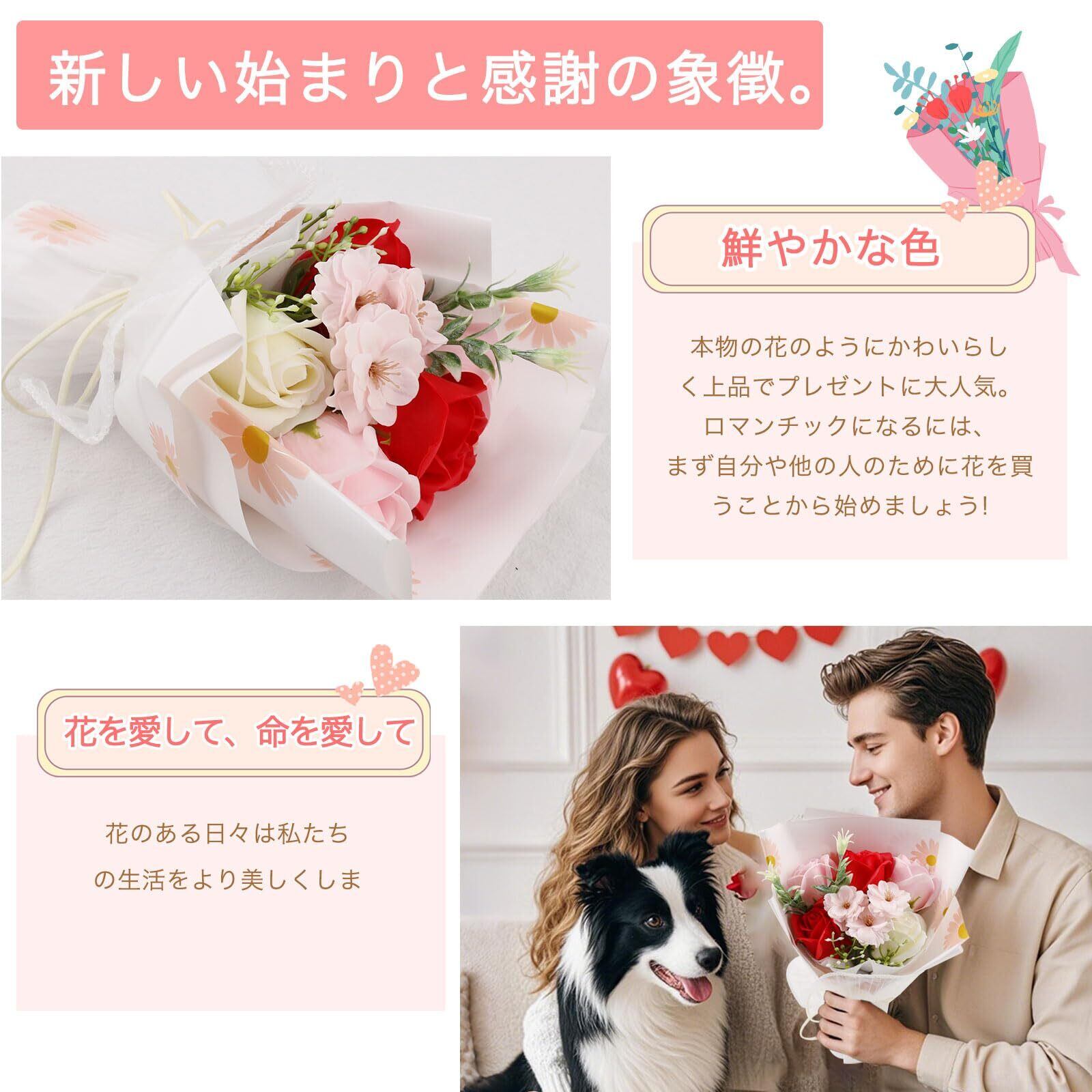 【様々なプレゼントに最適】高品質な石鹼素材で作られた優しい香り付きの観賞用ソープブーケ、花びらの数や咲いた姿も自然に成長するお花の特性に従ってつくられます。お誕生日プレゼント・開店祝い・新築祝い・結婚祝い・結婚記念日・出産祝い・歓送迎会・記念品・卒業祝い・入学祝い・お世話になった方へ・退職祝い・送別会・内祝い・お返し・自宅用・贈答用・記念日・母の日・父の日・敬老の日・お見舞い・お中元・お歳暮・クリスマス・バレンタインデー・ホワイトデーなどのフラワーギフトに最適です。
