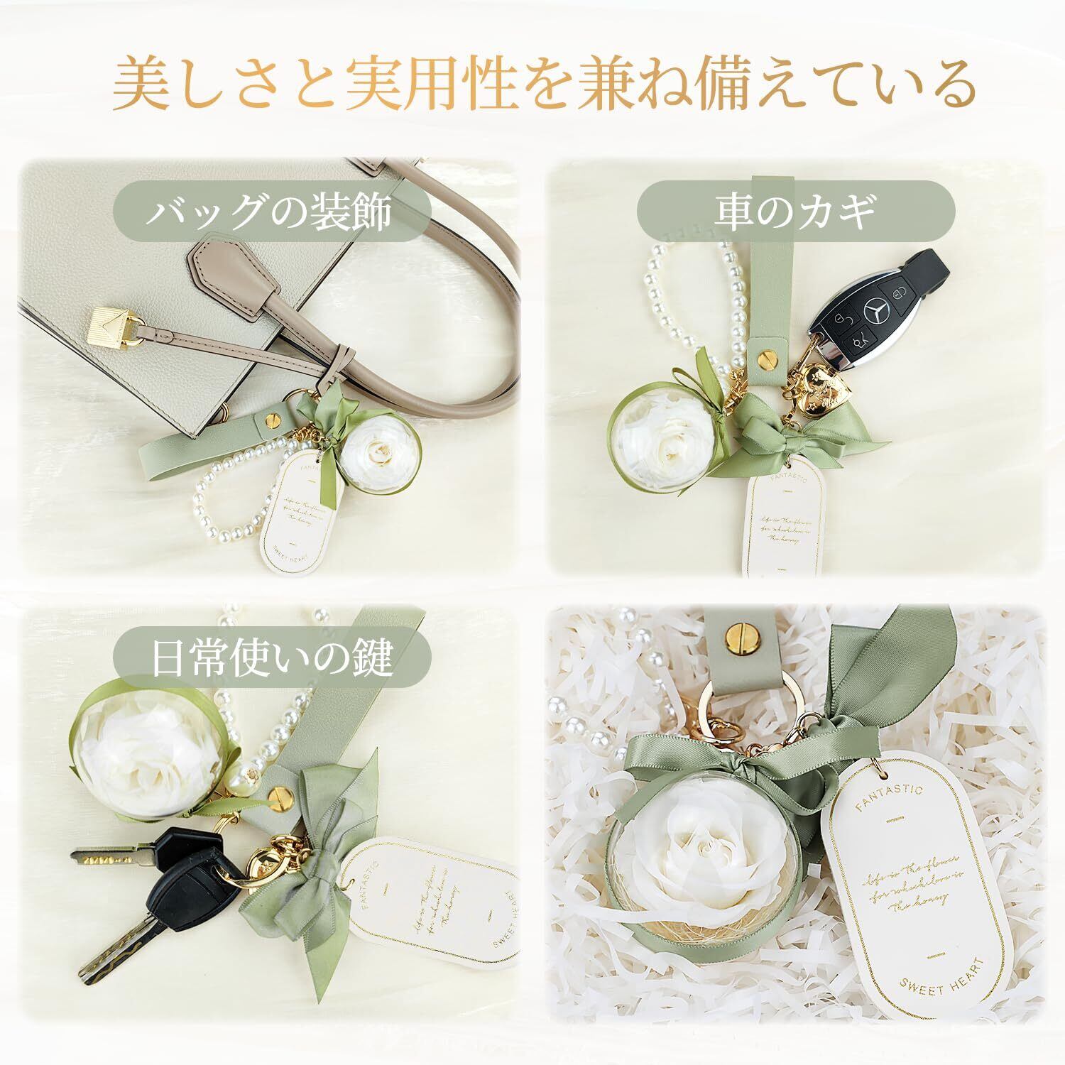 【プリザーブドフラワー 人気ギフトランキング】クリスマスに純白のバラのキーホルダーを贈って、純粋な愛を伝えましょう。枯れないバラ花言葉:「熱烈で真の愛・勇敢な慕情・心からの感謝」20代、30代、40代、50代、60代の女性に人気のギフト。記念日、バレンタインデー、ホワイトデー、プロポーズ、告白、結婚式、入学式、卒業式、誕生日、母の日、引越し祝い 、残暑見舞い 、お盆、敬老の日、クリスマス、退職祝い などに素敵でロマンチックな贈り物として、バッグチャーム、女性は美しいバラを断ることができません。