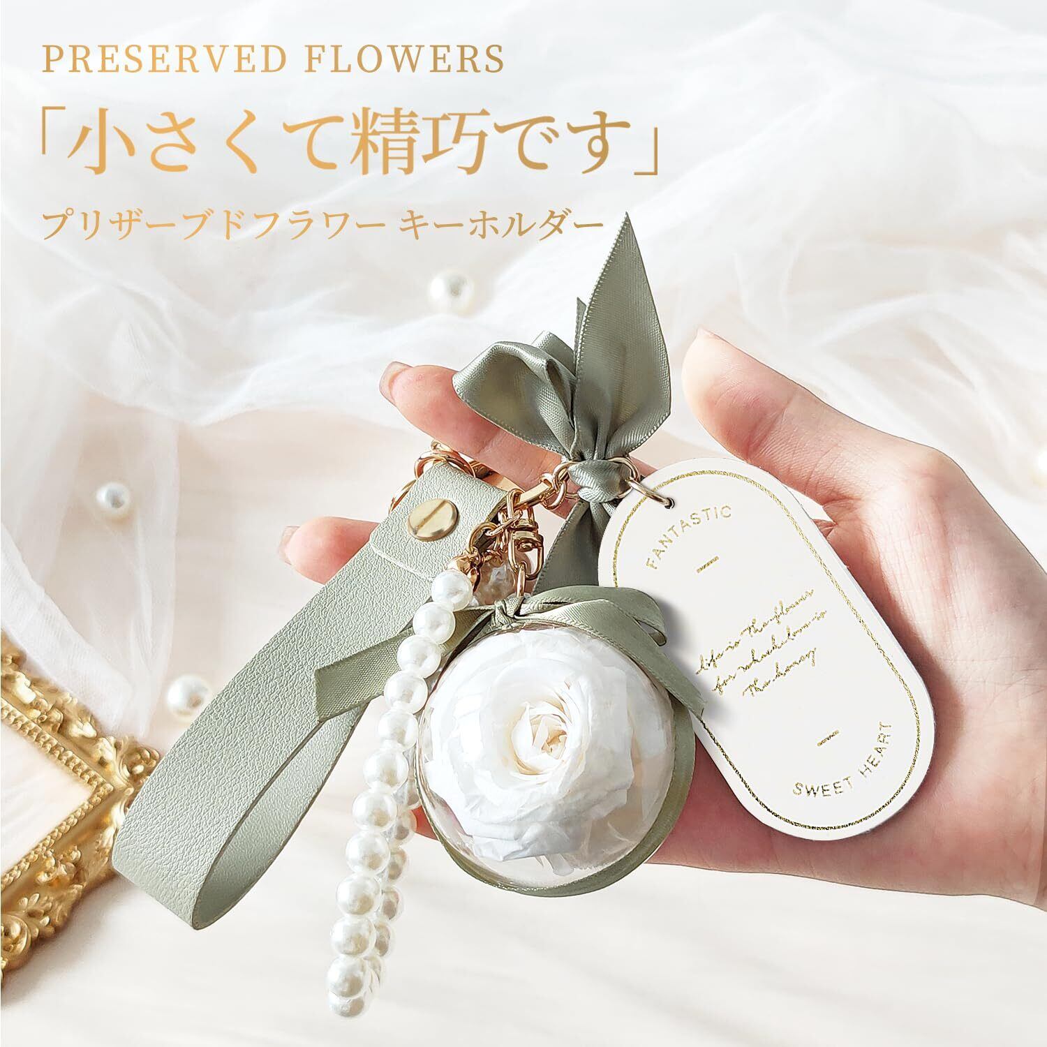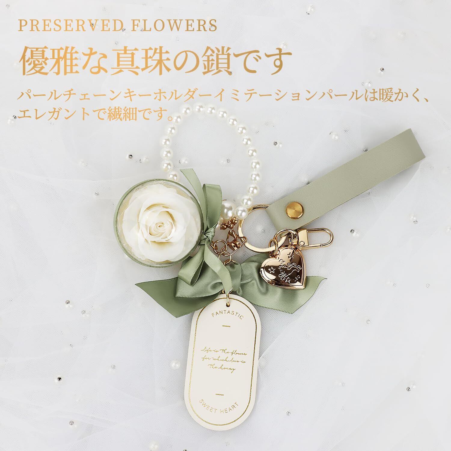 【豪華なキーホルダー】持ち運びができる可愛いアクセサリー『プリザーブドフラワーボール キーホルダー』可愛いお花を持ち運びしたいって言う お客様の声から誕生した。誕生日や結婚のお祝いはもちろん、母の日や敬老の日など様々な機会に贈ることができる素敵なデザインです。アクセサリー:キーホルダー、キーリング、レザー ベルトル、プラスチック真珠、合金の小さな写真立て、シルクのリボン。