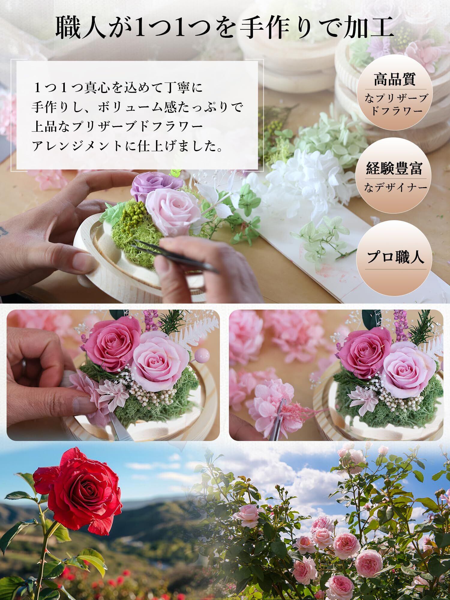 品質と自然な個性について:丁寧に作り上げた上質な商品は厳格な検品を経て出荷しておりますが、大変デリケートなため運送時の揺れや湿度の変化によって稀にヒビが入る可能性がございます。ガラス製品の特性上、万が一不具合がありましたら、24時間以内にお問い合わせください。※プリザーブドフラワーは天然素材のため、季節や収穫時期により花の色・形・大きさが異なります。一つひとつが職人の手作りによる「自然な個性」としてお楽しみください。