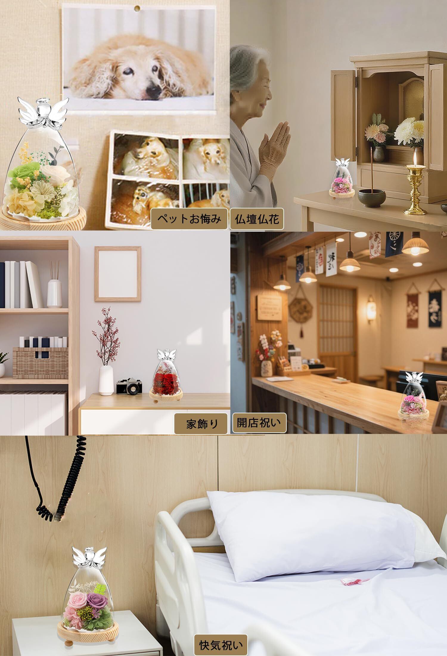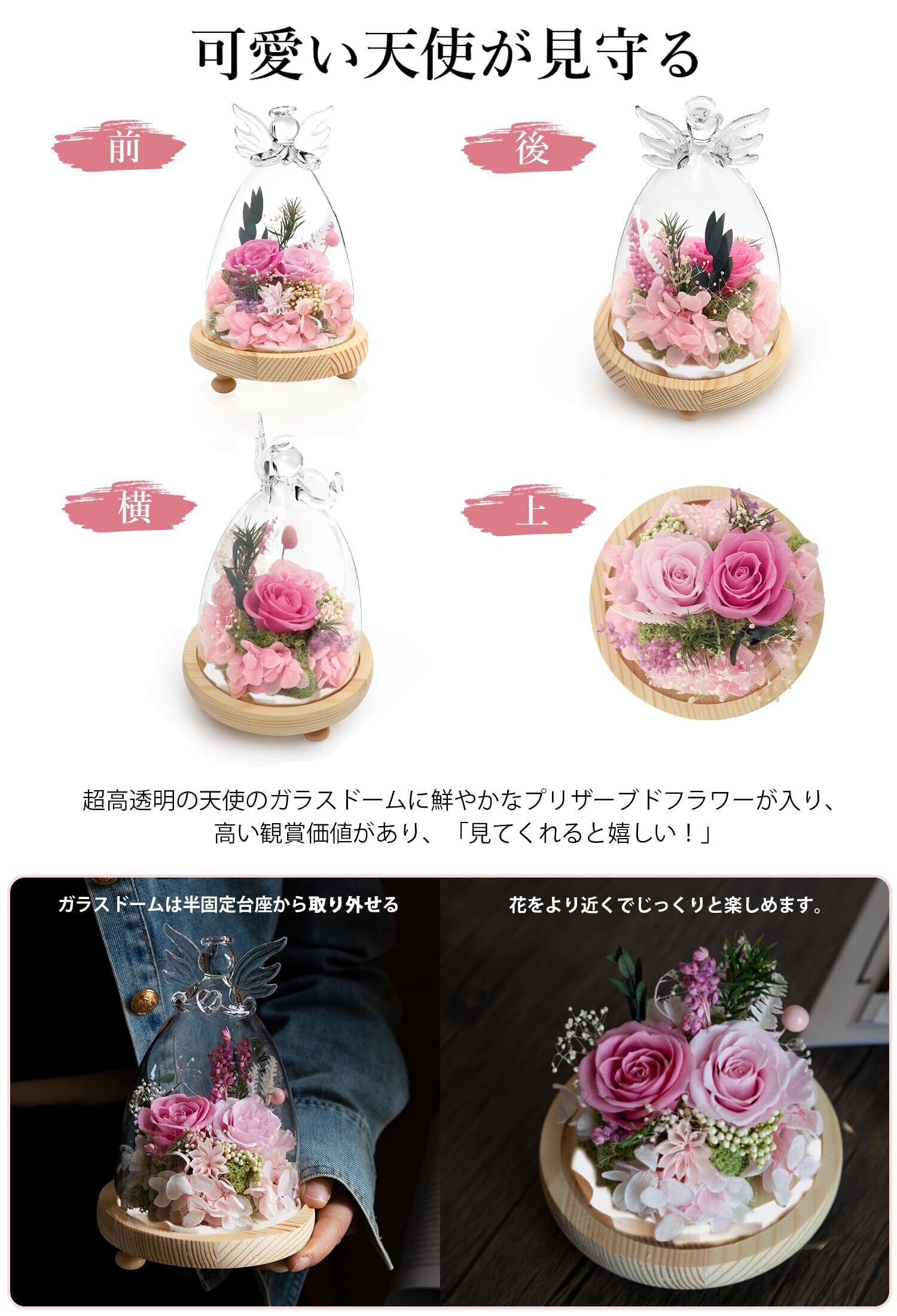可愛い天使が見守るガラスドーム:超高透明の天使のガラスドームに鮮やかなプリザーブドフラワーが入っり、どこから見てもお花を楽しめるオールラウンドのデザインで高い観賞価値があります。お花をより間近で楽しんで頂くために、ガラスドームの蓋は取り外しできるようになっています。なお天使モチ一フのガラスドームで、守護・想いを伝える・愛を引き寄せる・美の運気を高める・癒しなどポジティブな意味があります。