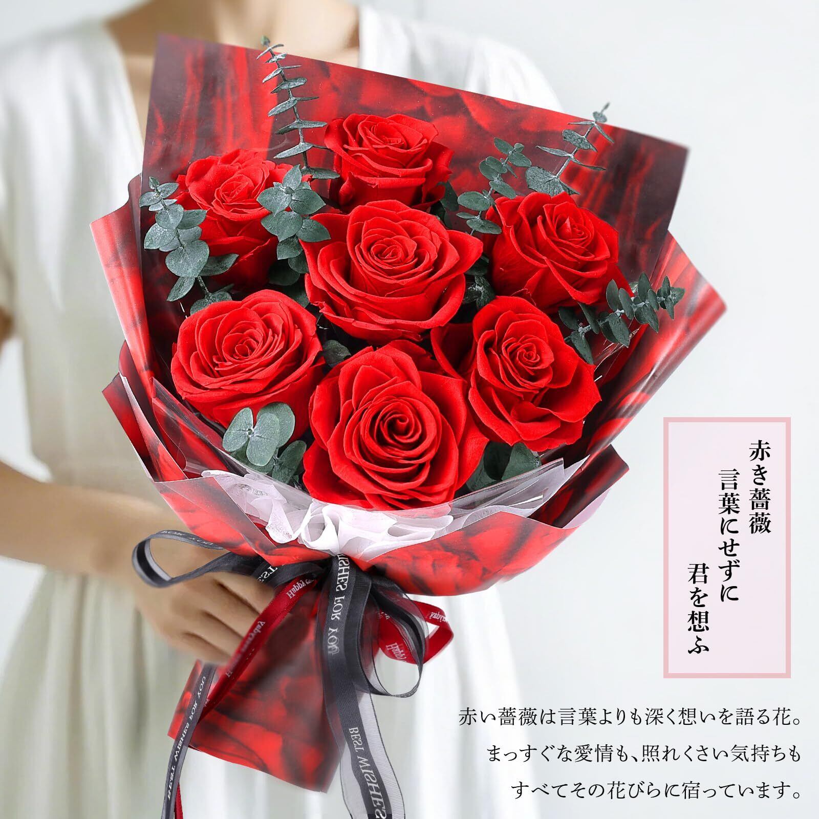 【手入れ不要、3年以上咲き続ける】この7本バラ花束は、日本から発展したプリザーブドフラワー技術を用い、高品質な生花とバラを選んで丁寧に加工されています。生花のように儚く枯れることがなく、3年以上その美しさを保ちます。さらに、水やりやお手入れが不要で、そのまま飾って花の美しさを気軽に楽しむことができます。