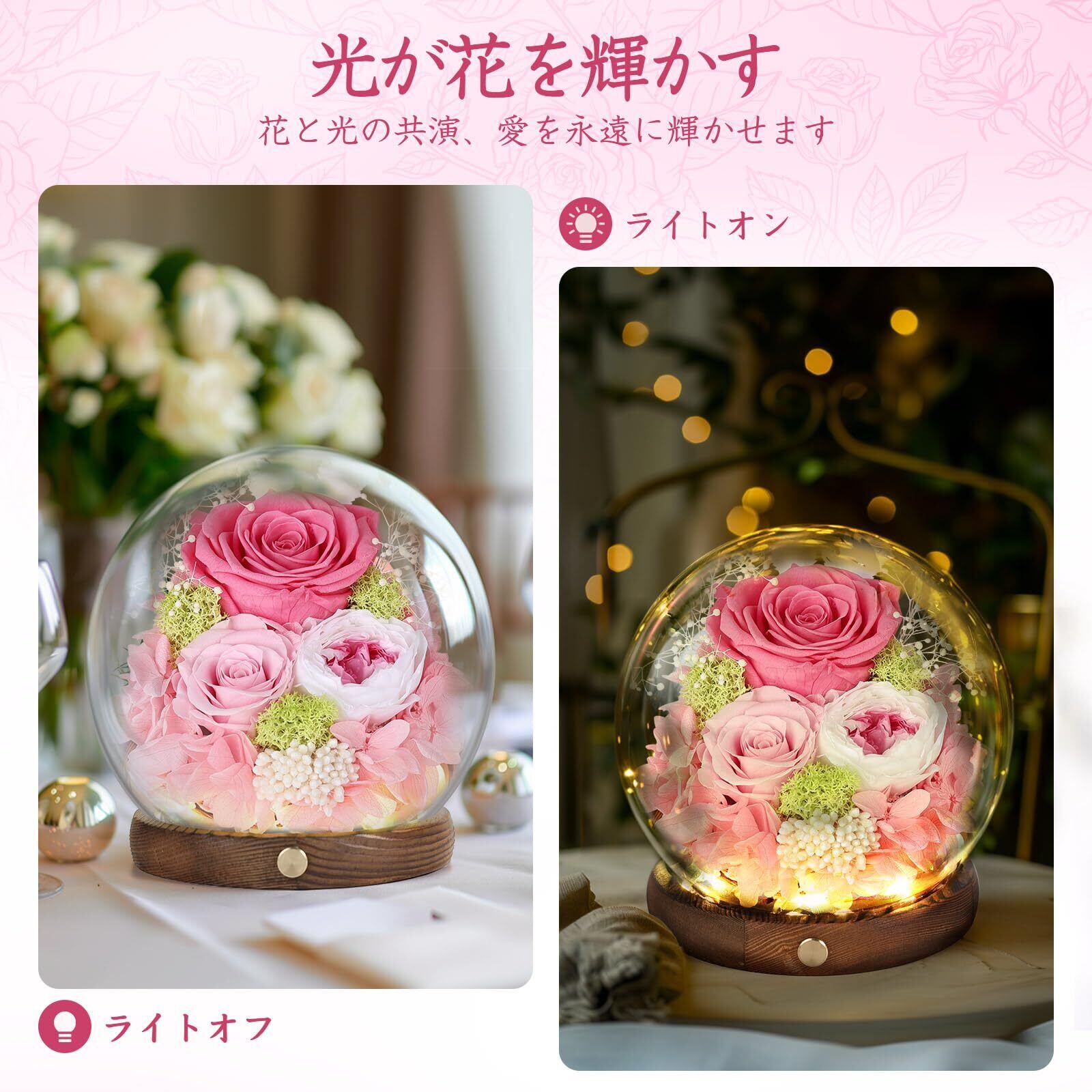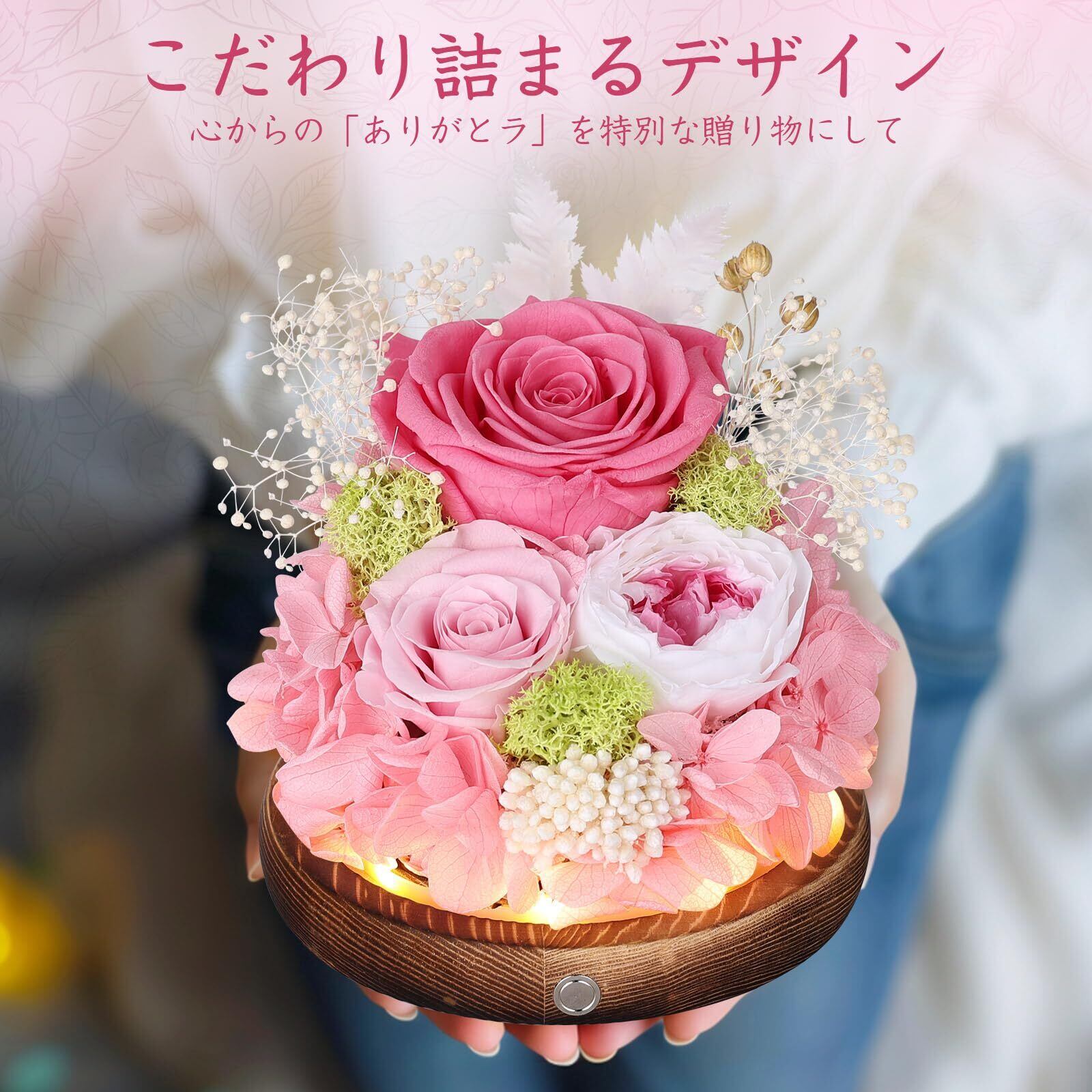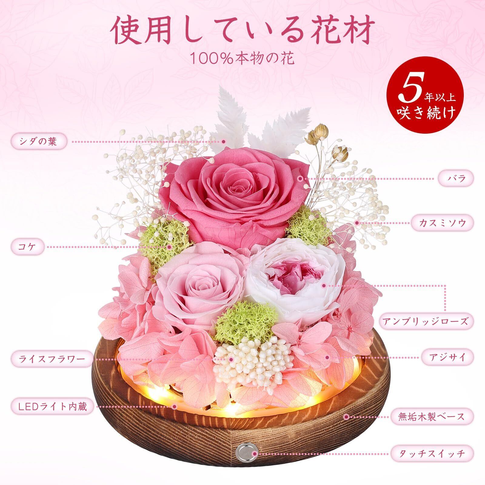 プリザーブドフラワー ガラスドーム ピンク 枯れない花 本物のバラ LEDライト付き アレンジメント ホワイトデー お返し 女性 人気 お花 お祝い 誕生日プレゼント