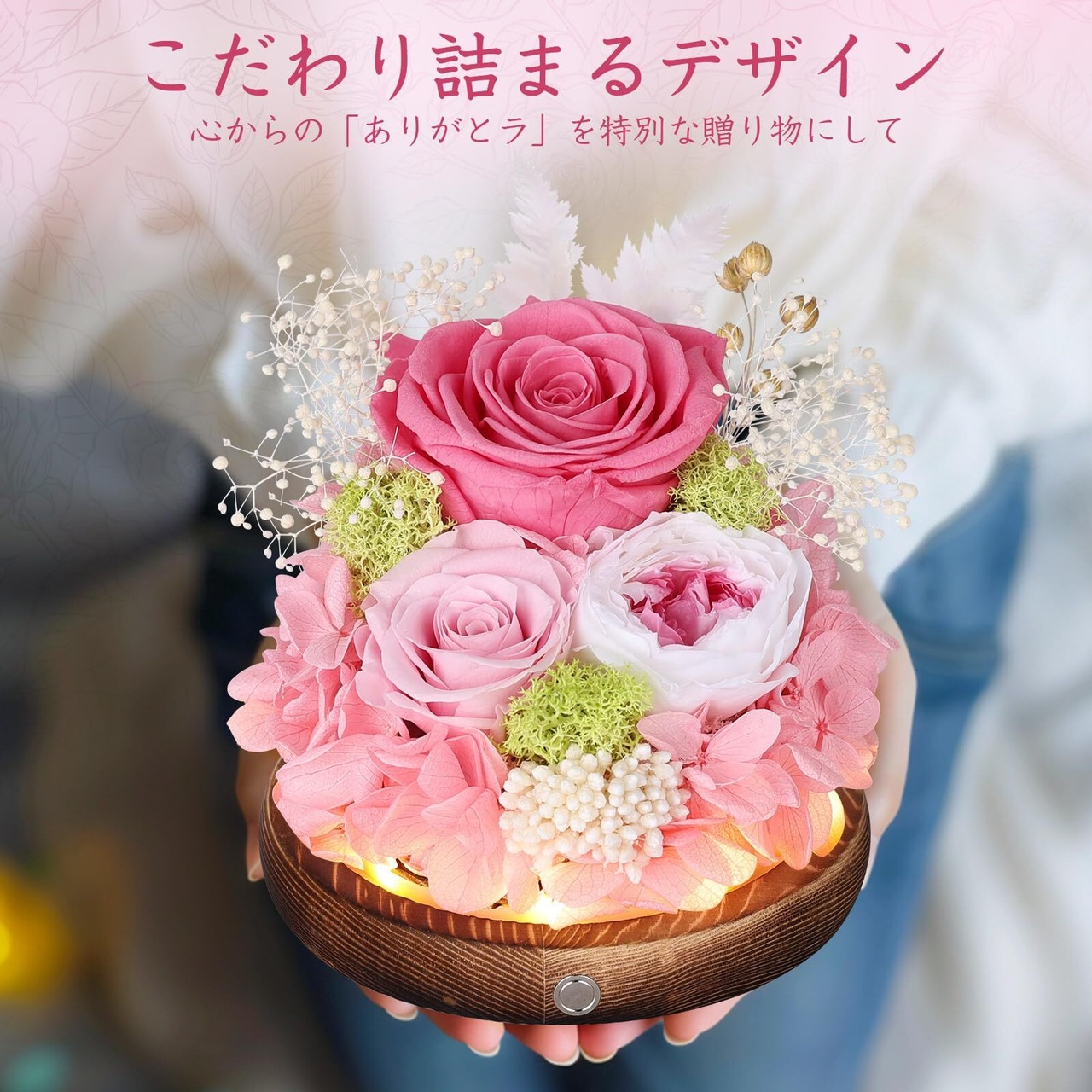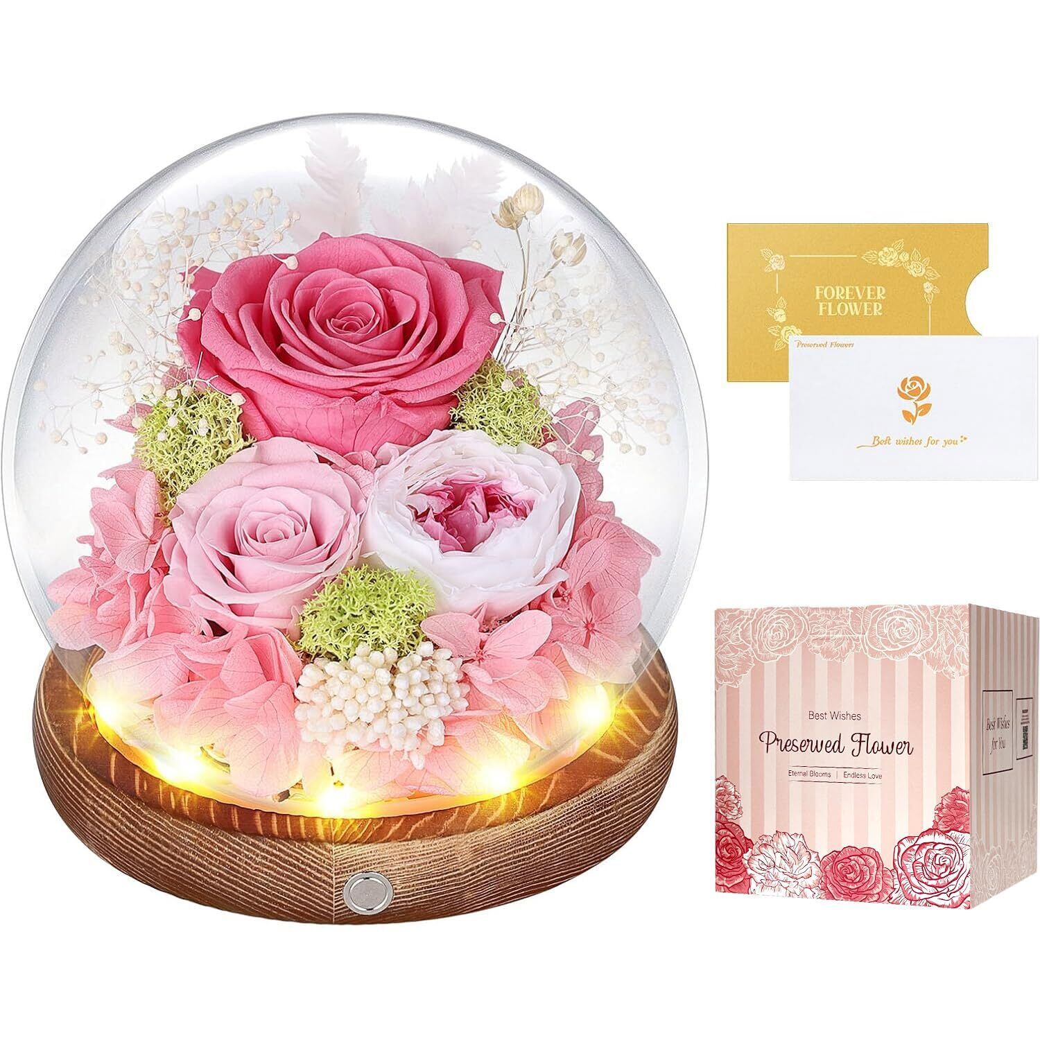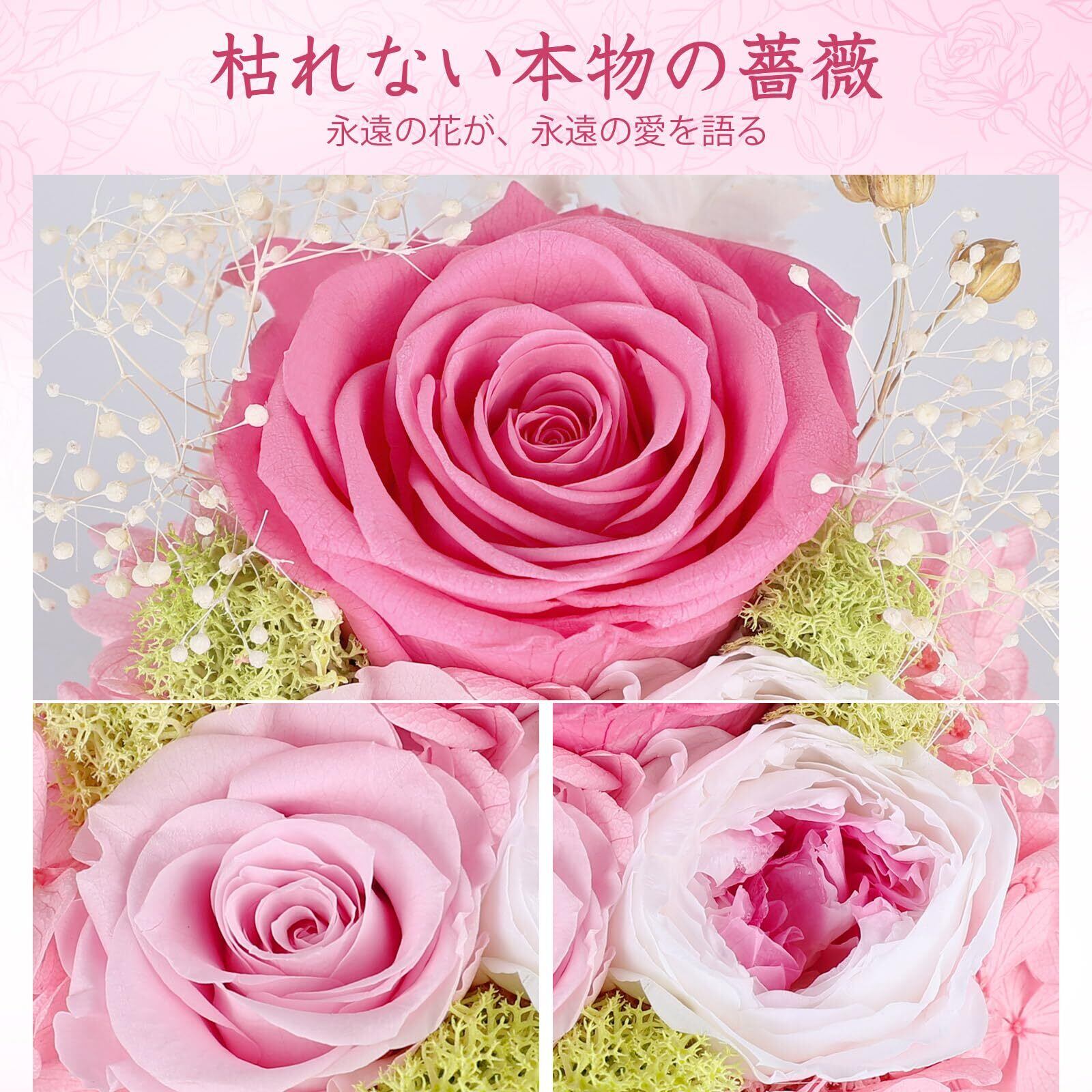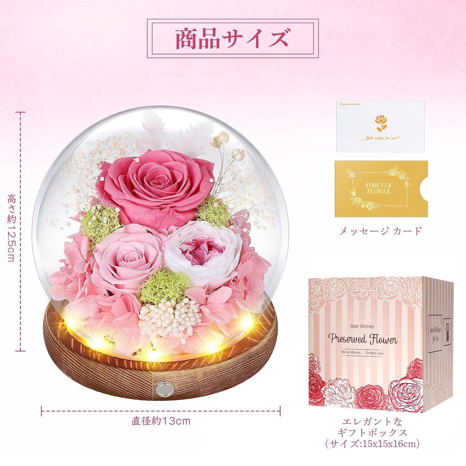 プリザーブドフラワー ガラスドーム ピンク 枯れない花 本物のバラ LEDライト付き アレンジメント ホワイトデー お返し 女性 人気 お花 お祝い 誕生日プレゼント