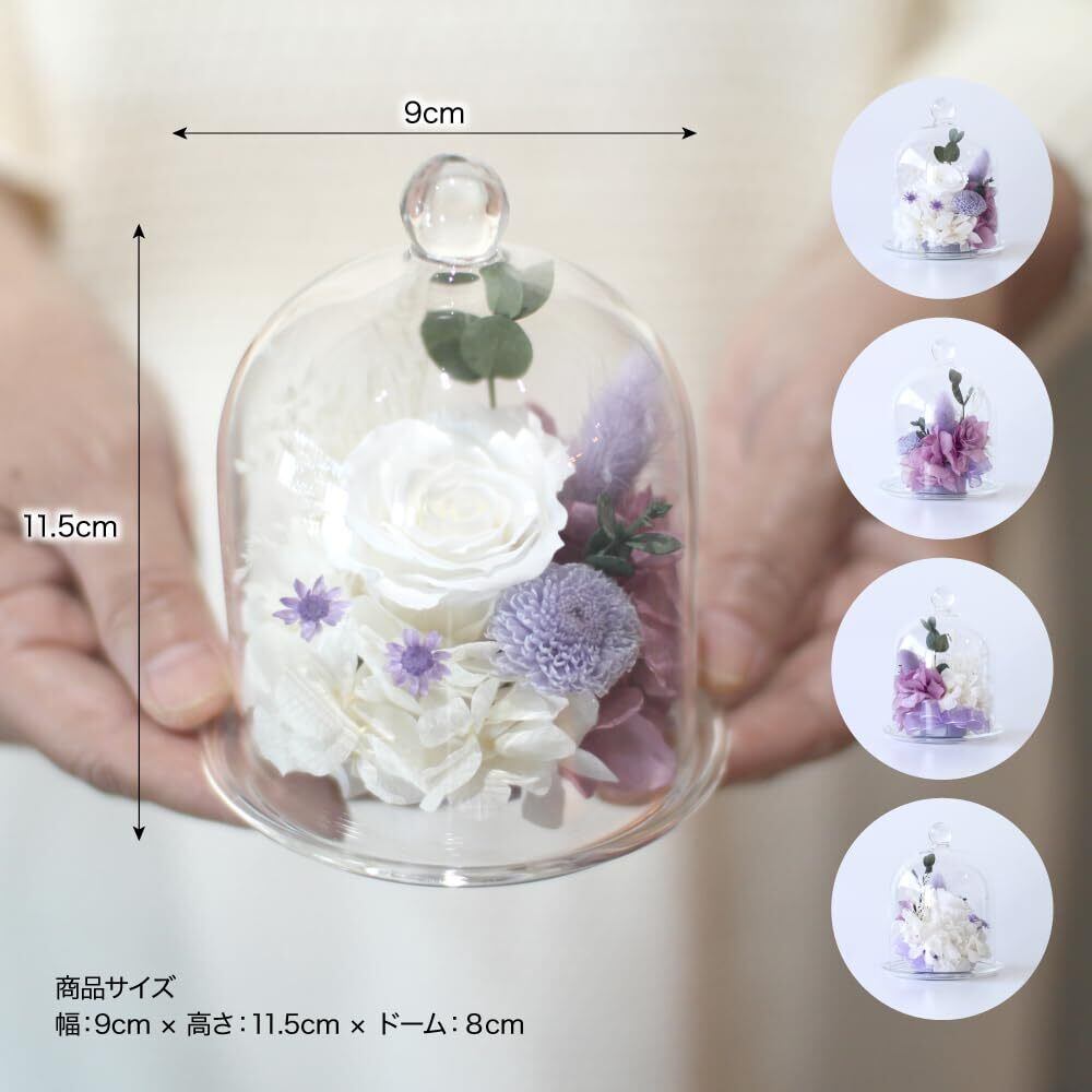 【おしゃれなガラスドームのブリザーブドフラワー】想いが届くようにとお作りした優しく清楚な雰囲気のプリザーブドフラワーのフラワーギフトです。ガラス製のドーム型の花器に白と淡い紫系のお花を優しい雰囲気でアレンジしました。 【お供えのフラワーギフトに最適】お供え花としては生花を使用するのが一般的ですが、生花の場合ですとお花の寿命がございますので、水やりやお花を代えるという手間が少しかかります。その点プリザーブドフラワーの場合、水やりの必要も無く、お花の持ちも生花に比べて長いですので、手間がかかりません。忙しくてなかなか故人を偲ぶ事ができないけど、お花を供えたいという方におすすめのお花でございます。