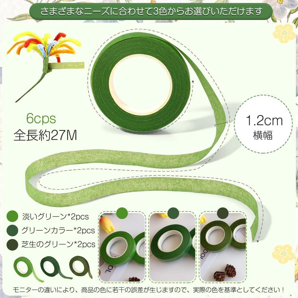 セット内容:フローラルテープ6個セット;横幅1.2CM、全長約27M;グリーンカラー*2pcs+淡いグリーン*2pcs+芝生のグリーン*2pcs;さまざまなニーズに合わせて3色からお選びいただけます。モニターの違いにより、商品の色に若干の誤差が生じますので、実際の色を基準としてください!