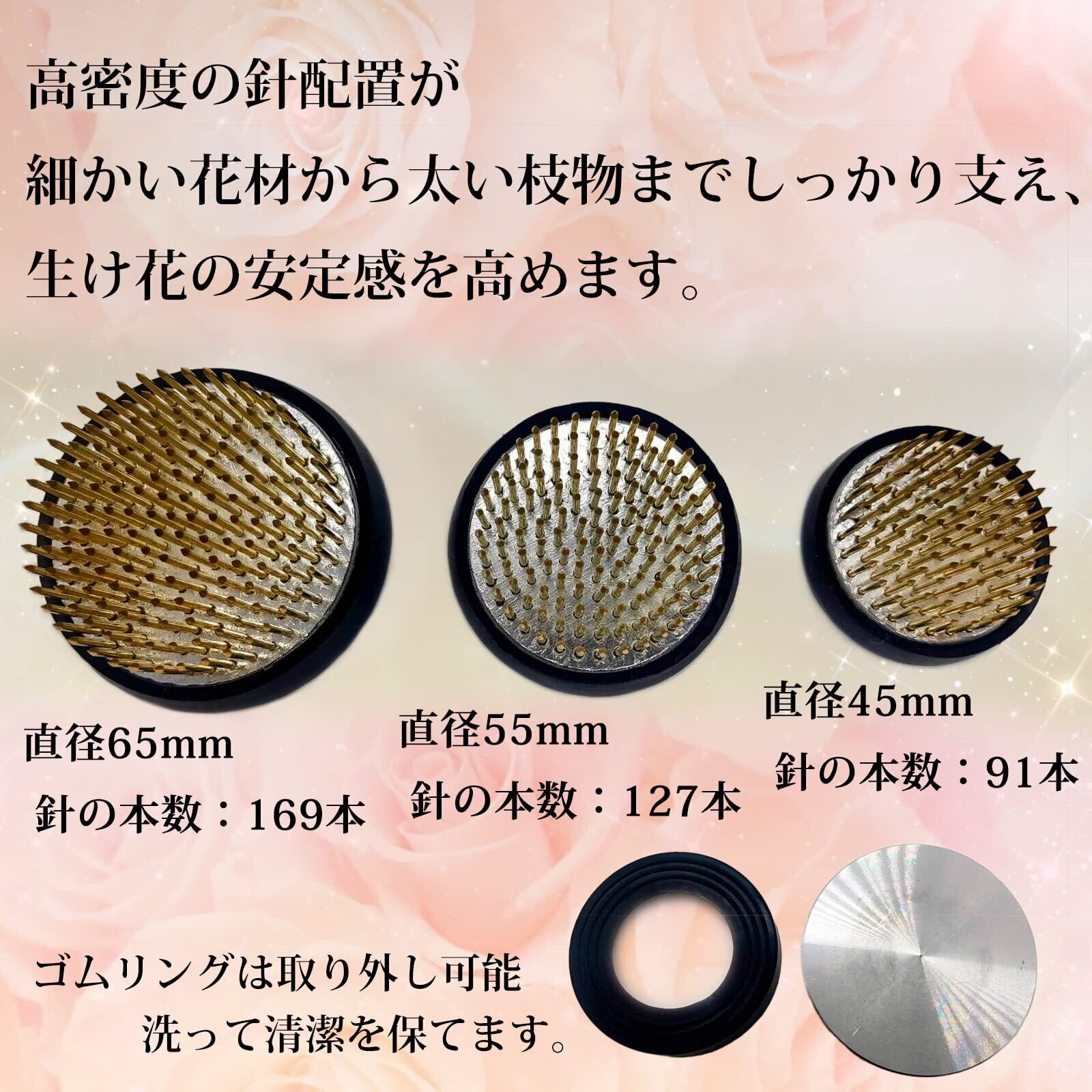 ゴムリング付き剣山3点セット(3.5㎝、4.5㎝、5.5㎝)です。初心者から上級者まで幅広くご使用できるセットです。