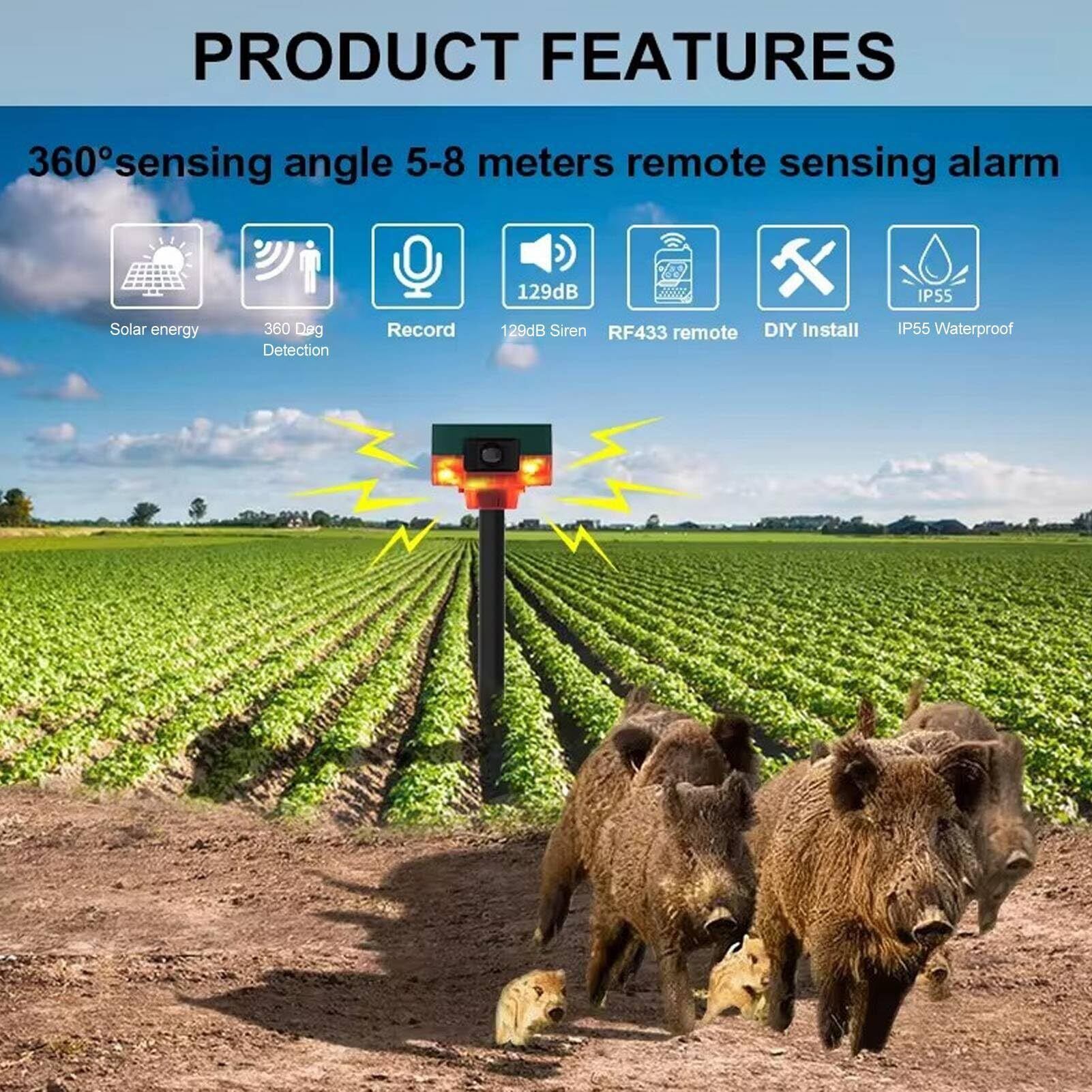 360°カバレッジと勧告警告:3つのモーション検出器を備えたモーションセンサーアラームのソーラーアラームは、5〜8メートル以内の動きを検出し、音と光のアラームを起動します。 129dbの音量のサイレンと6つの明るく点滅するLEDにより、あなたの敷地への動物や侵入者を阻止します。
