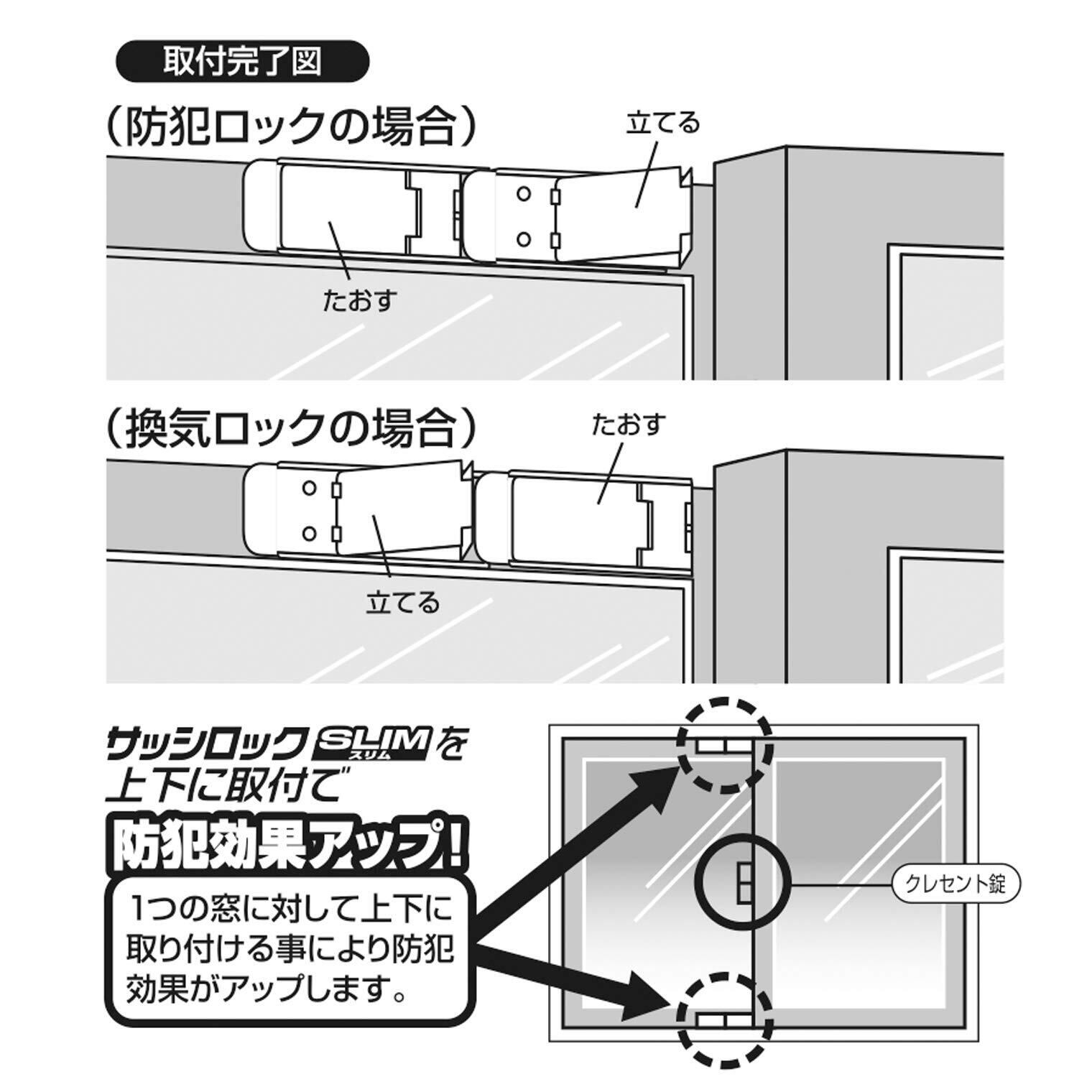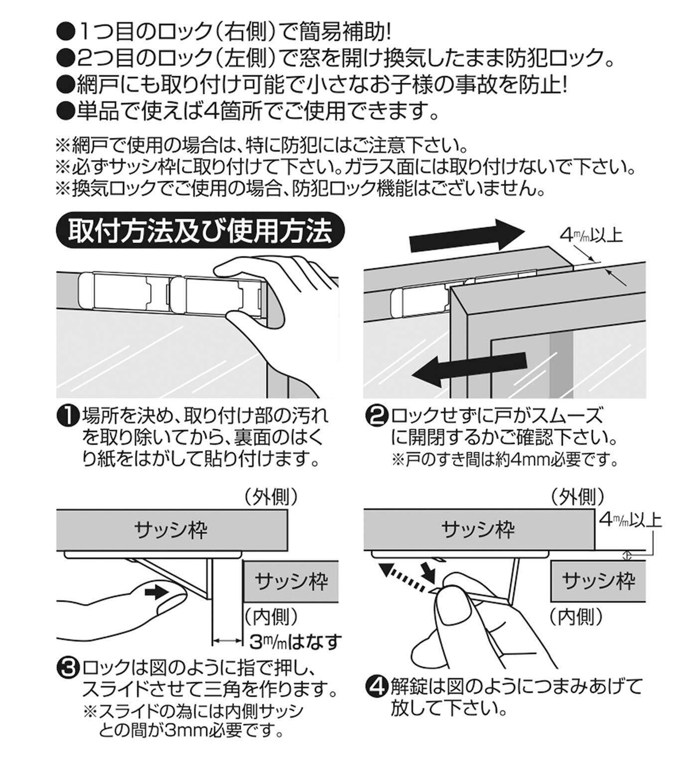 サッシ枠に取り付けて、補助的に窓をロック。 取り付け位置によって開閉位置の調整が可能。 横に2個並べて使えば、「窓を閉じた状態」「少し開いた換気状態」の2通りでロックできます。 サッシのクレセント錠との併用で防犯効果アップ。 もちろん、単品で4箇所の簡易補助錠としても使用できます。 網戸にも取り付けられるので、お子さまの安全対策にも効果的。 素材・材質:ステンレス、粘着テープ 生産国:タイ ●取付可能寸法=クレセント錠を開錠した状態で、外側・内側サッシ枠の間4mm以上の隙間が必要です。