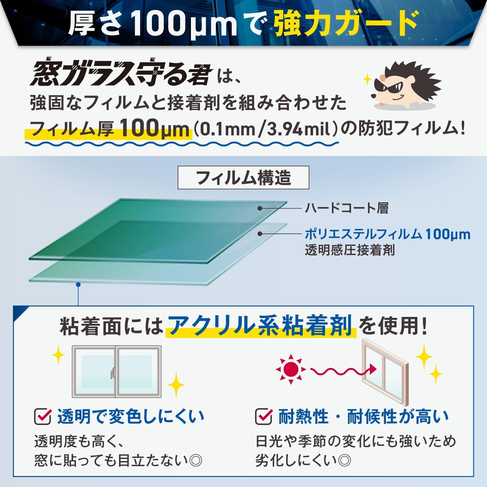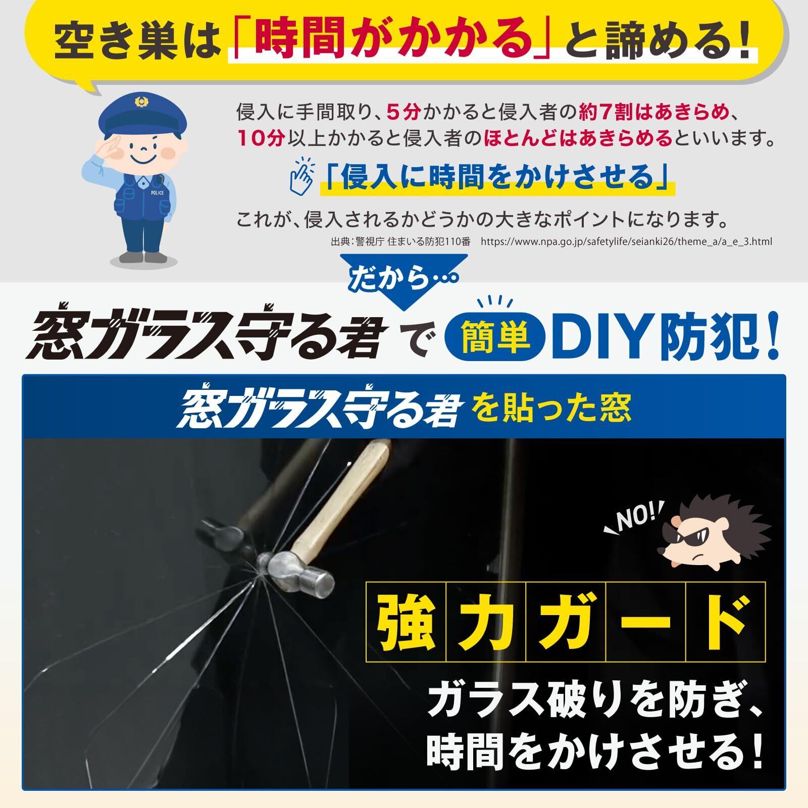 【貼るだけ簡単!DIY防犯】「窓ガラス守る君」は、貼るだけで窓ガラスを強化し、空き巣対策・セキュリティ対策ができる防犯グッズです。防犯シール付きで抑止効果も◎【強力ガード】 粘着面にはアクリル系粘着剤を使用しており、透明度が高く変色もしにくいため、窓に貼っても目立ちません。また、耐熱性・耐候性にも優れているため、日光や季節の変化にも強く、劣化しにくい粘着剤です。
