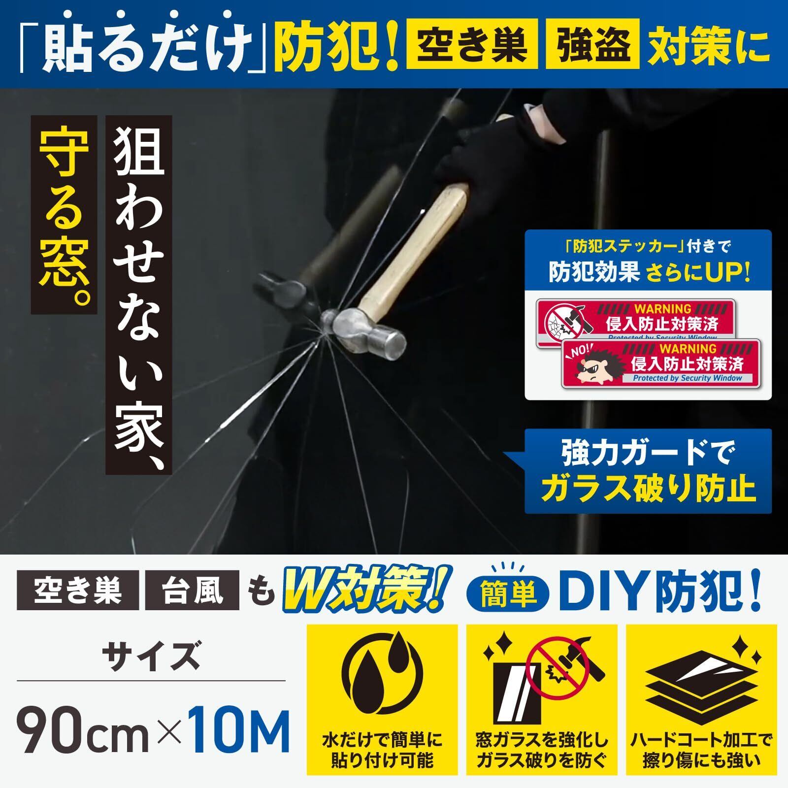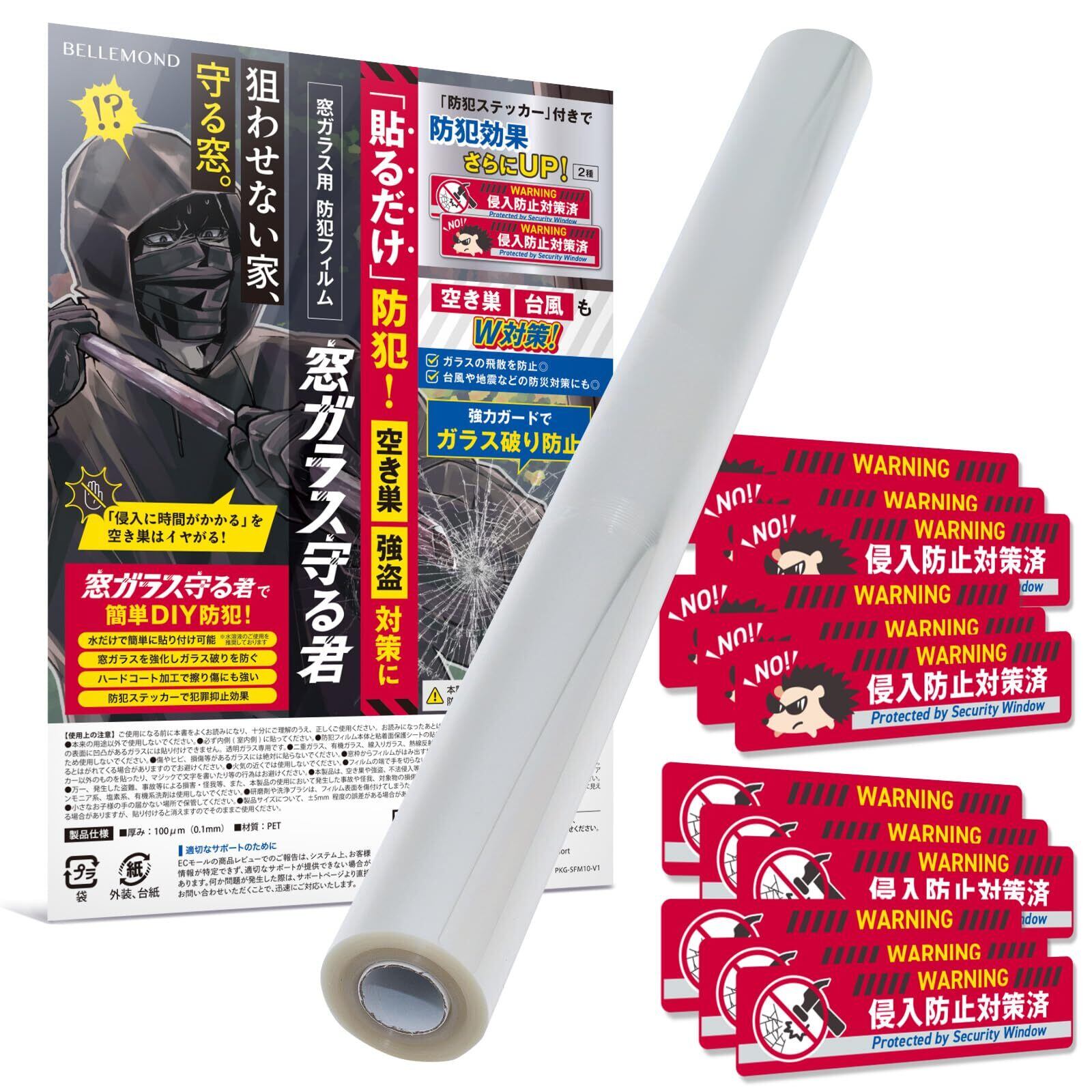 【 窓ガラス 守る君 】防犯フィルム 100ミクロン 90cm×10M 1ロール | 防犯ステッカー 12枚付属 | 窓 ガラス飛散防止 強化 防犯 フィルム シート 防犯グッズ 空き巣対策 セキュリティ 防災 台風対策 透明 | 大判 大きめ ベルモンド B1468