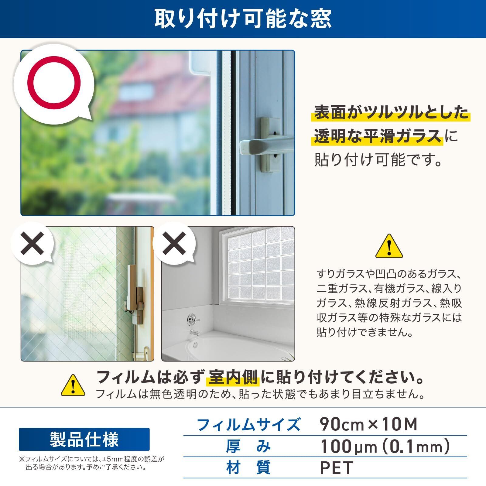 【製品仕様】セット内容:フィルム×1ロール、防犯ステッカー×12枚(デザイン2種類、各6枚) / フィルムサイズ:約 90cm×10M / 厚み:100μm (100ミクロン / 0.1mm) / 材質:PET※サイズは、5mm程度の誤差がある場合があります。予めご了承ください。