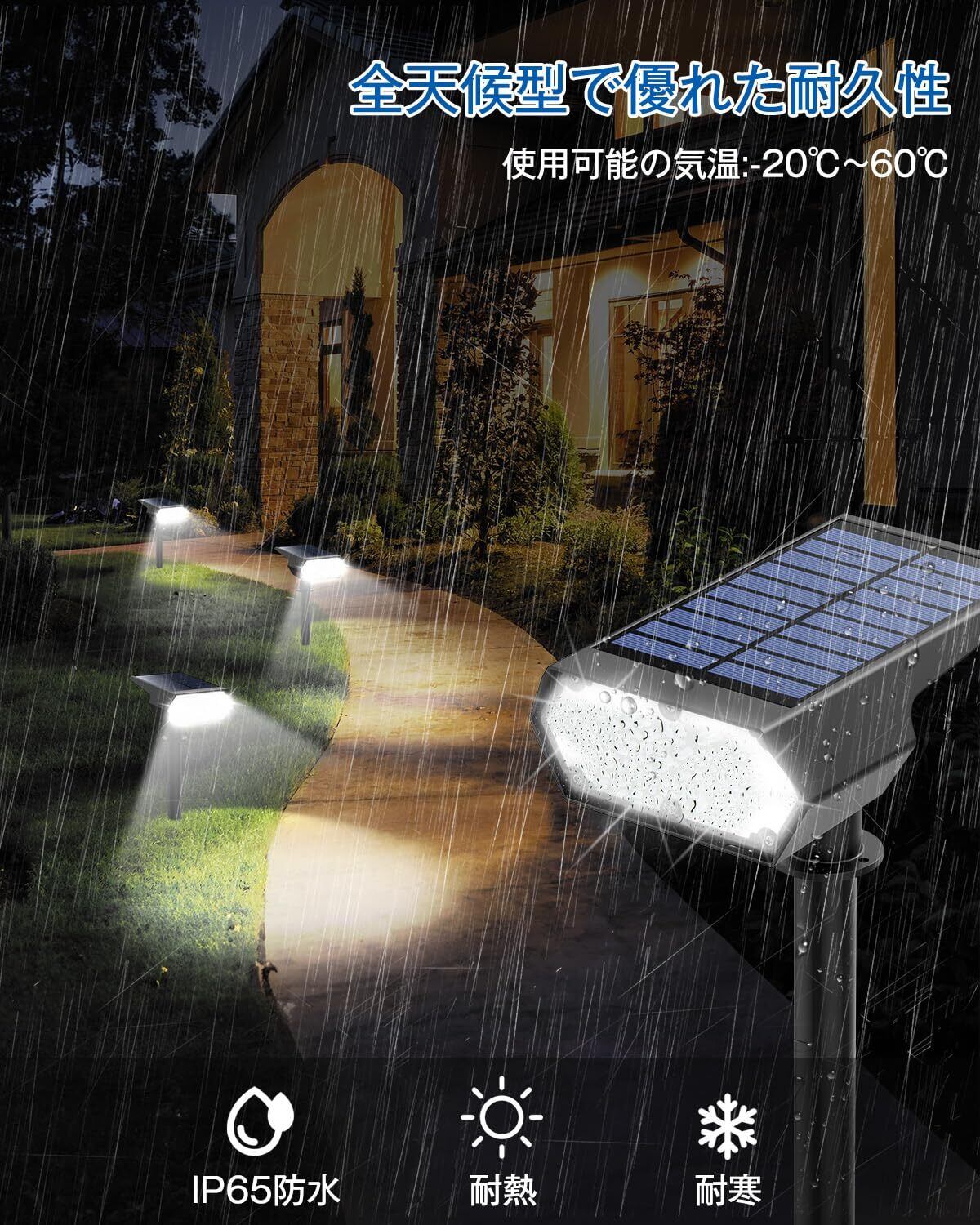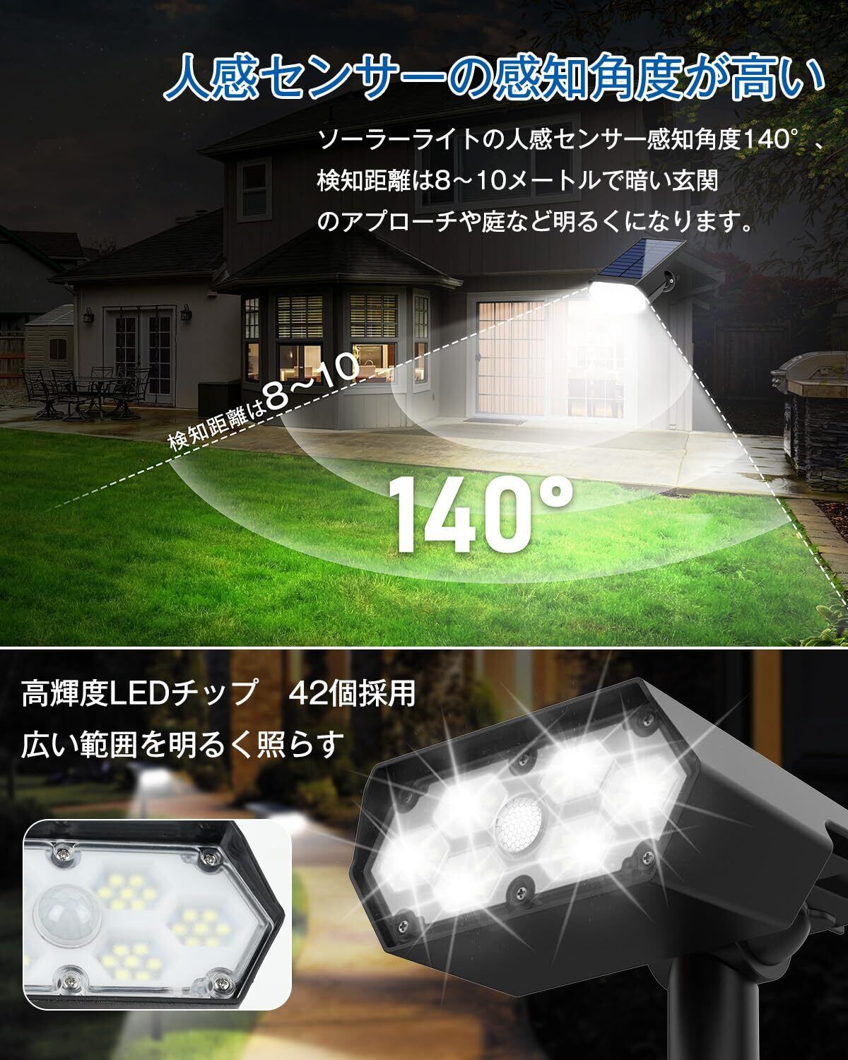 センサーライト 屋外 防水 人感センサー ソーラー スポット ガーデンライト 自動点灯 防犯 昼光色 42LEDs 高輝度 2200mAh大容量バッテリー IP65防水 ガーデン 玄関 庭園 車道 歩道 駐車場 屋外 照明 2個セット