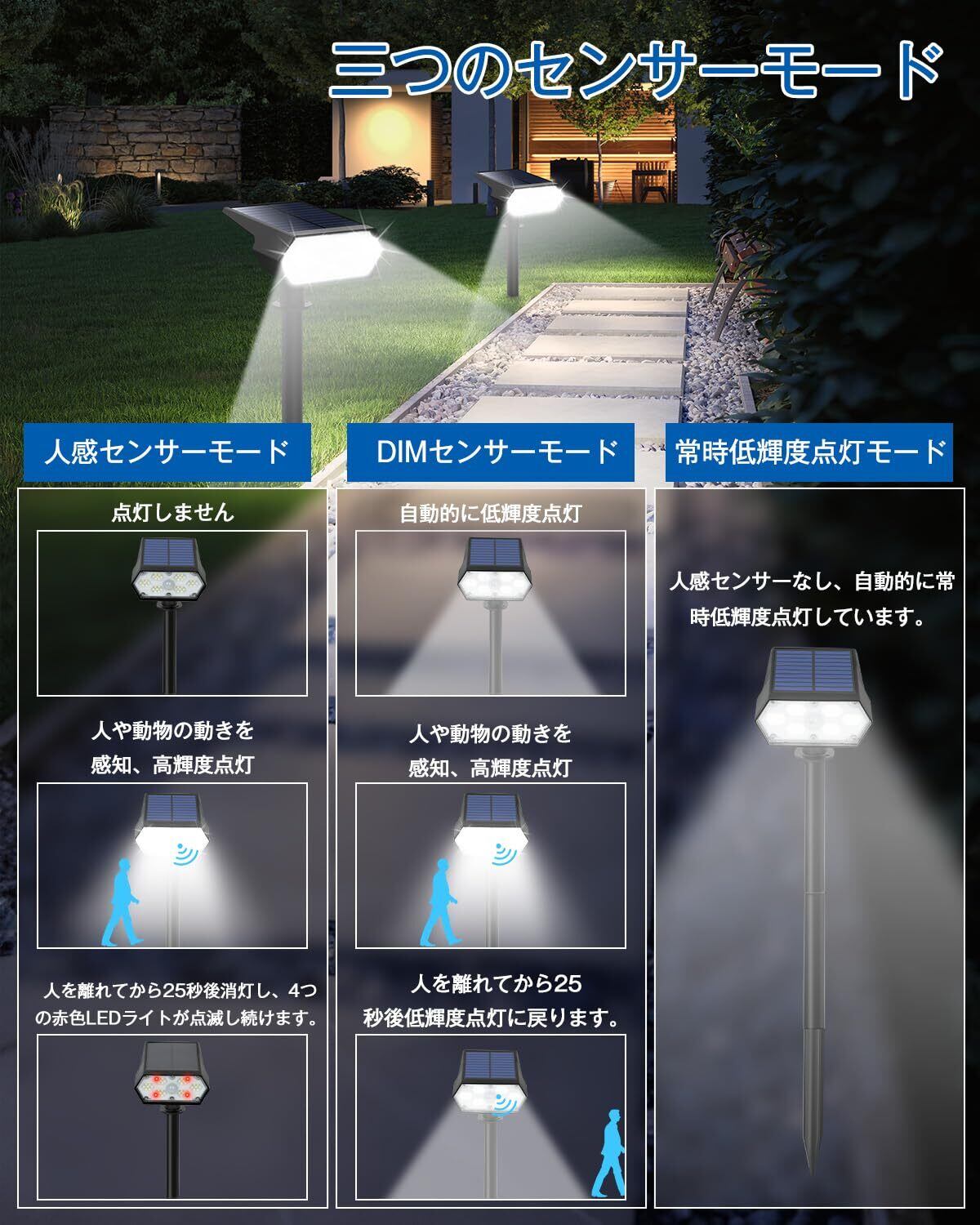 【3つのセンサーモードを選べる】ソーラーライト 屋外の後ろのボタンを押して3つのセンサーモードを備えたセンサー照明で様な使用シーンに対応可能。「人感センサーモード」夜や暗くなっても点灯しなく、人や動物の動きを感知すると高輝度点灯します。人を離れてから25秒後に自動で消灯、4つの赤色LEDライトが点滅し続けます。「DIMセンサーモード」夜や暗くなって自動で低輝度点灯し、感知範囲内に動きを感知すると高輝度点灯に切り替わり、人を離れてから25秒後低輝度点灯に戻ります。「常時低輝度点灯モード」人感センサーなし、周囲が暗くなると自動で低輝度点灯しています。【ご注意:モードを切り替える際に、センサー照明が2回点滅して提示としています。】