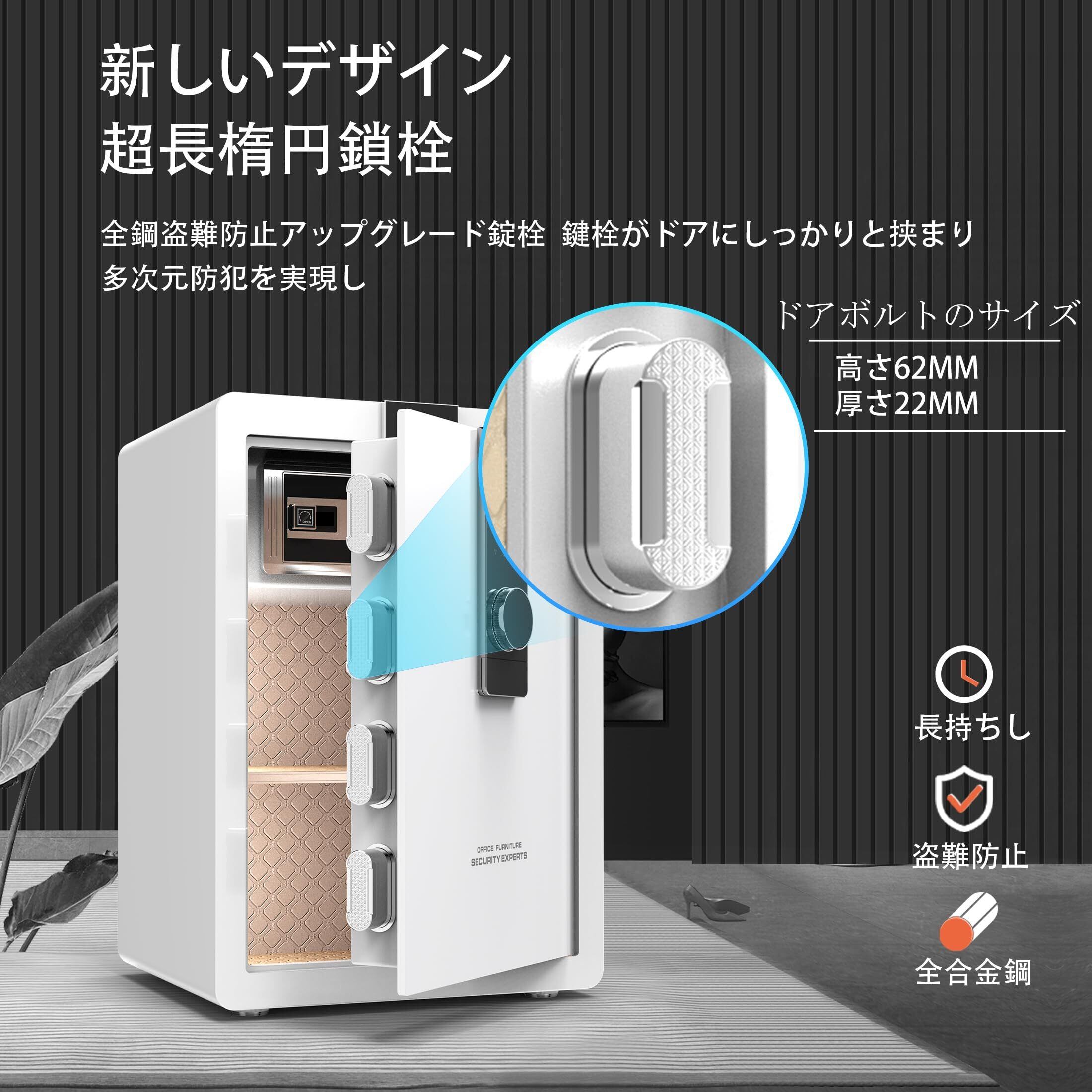 【頑丈な五重セキュリティ保護】 (1)硬鋼材料、破壊防止の高硬度の素材を採用し、破壊や切断されることを防き、お客様の貴重品は大切に保管できます。 (2)ハンドルノブには最新の技術を採用し、乱暴な開錠を防止し、安心してご使用できます。 (3)こじ開けを防ぐための合金鋼強化ドーア、防犯性もアップさせます。 (4)金庫は超長い楕円形のロックボルトを備えており、全鋼製の防犯強化されたロックボルトは、扉内にしっかりと嵌まり、多次元の撬り防止を実現します。(5)金庫が激しく揺れたり、パスワード入力が5回間違ったりすると、セキュリティアラームが1分間トリガーされます。