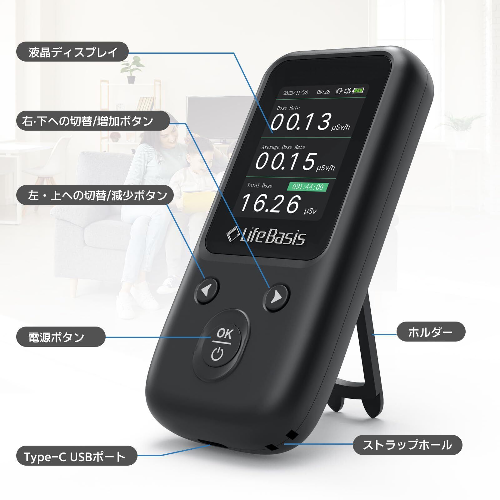 【持ち運び便利で使いやすい】 LifeBasis携帯型放射線測定器はコンパクトで手のひらサイズ。片手での操作が可能です。カバンなどに入れても邪魔にならないため、収納や持ち運びに大変便利です。本体サイズ: 5.2cm x 11.2cm x 1.96cm / 重量: 220g内蔵の充電式リチウムイオン電池により、フル充電後は最大10時間の連続使用が可能です。