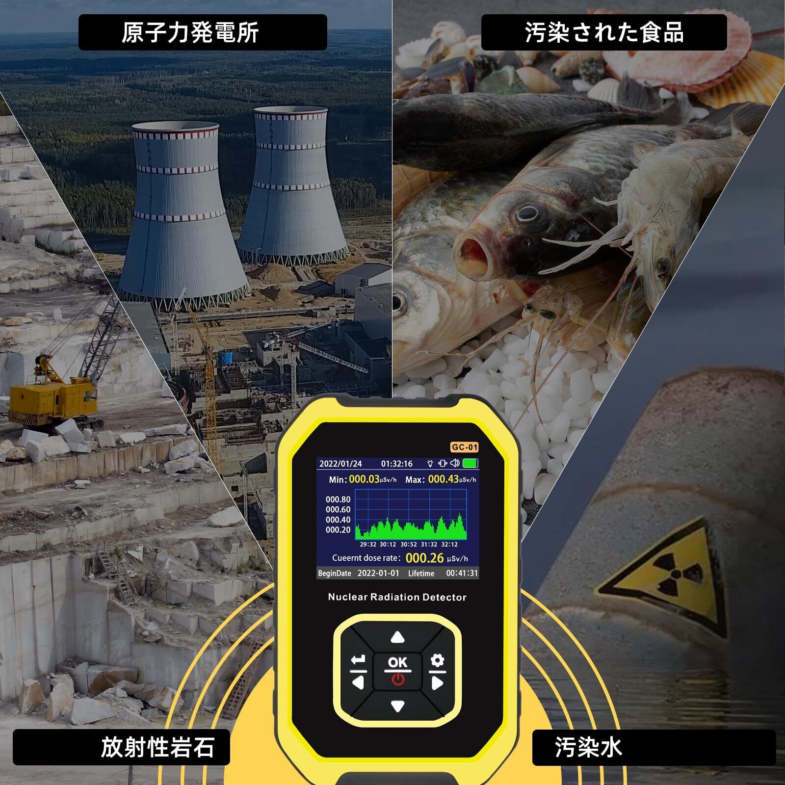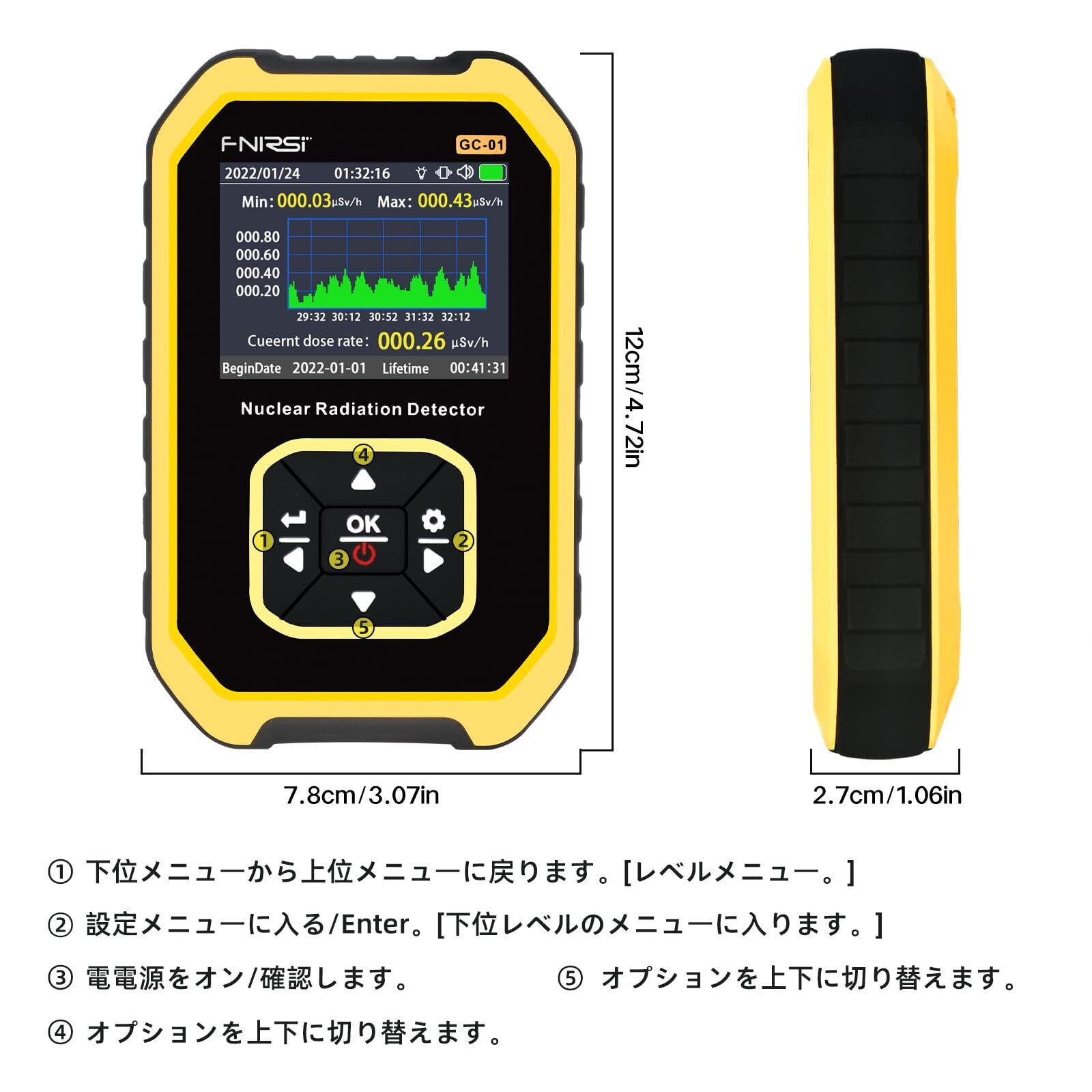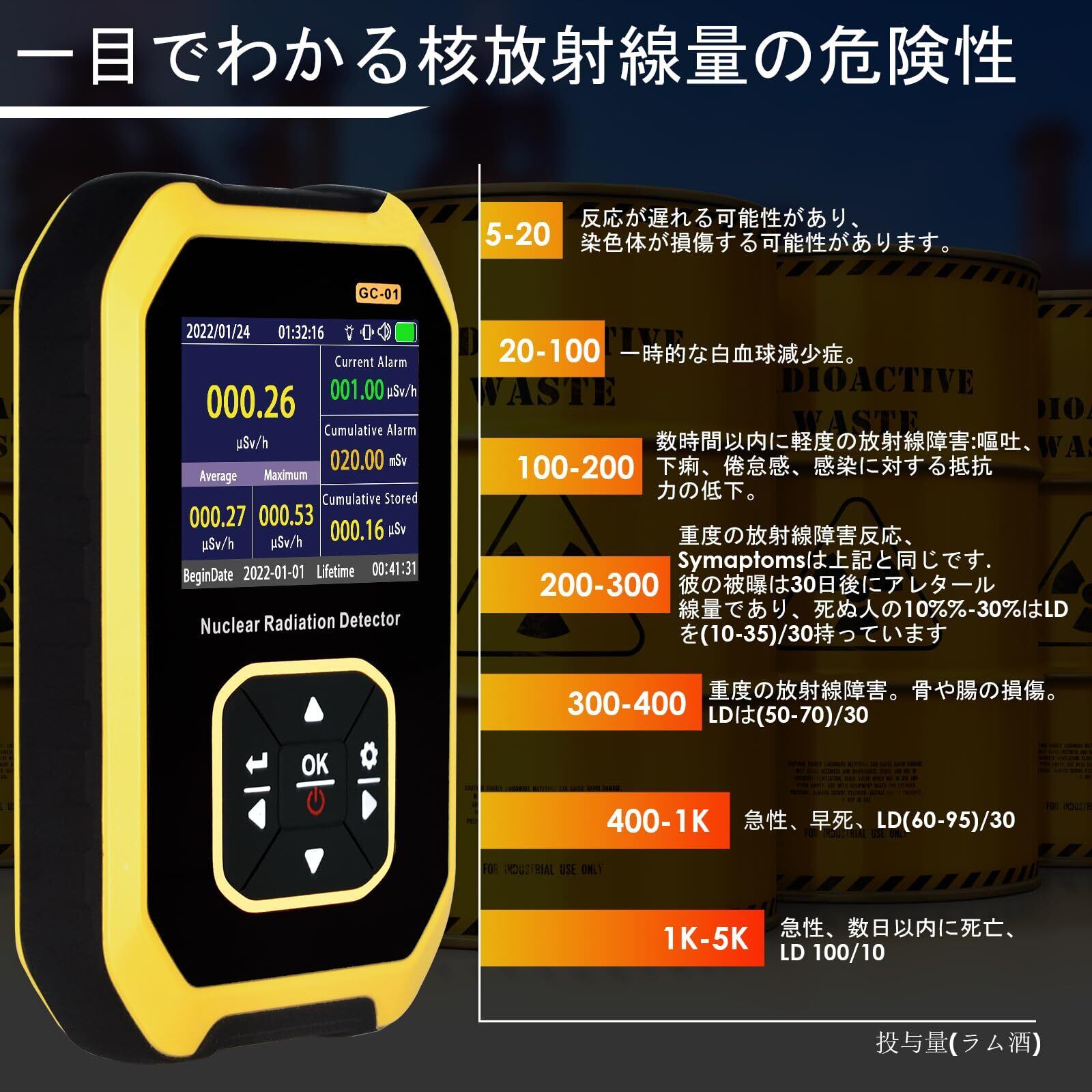 【デジタルガイガーカウンター】プロ仕様エネルギー補正GM管搭載。放射線量計GC-01は放射性物質を高感度・高精度で検出。線量当量率0.0~10000μSv/h(マイクロシーベルト毎時)、累積線量500.0mSv(ミリシーベルト)まで測定可能。48keV~1.5MeVのエネルギー範囲(137Csγ線で誤差±30%以内)、Co-60に対する80CPM/μSvの高感度を実現。