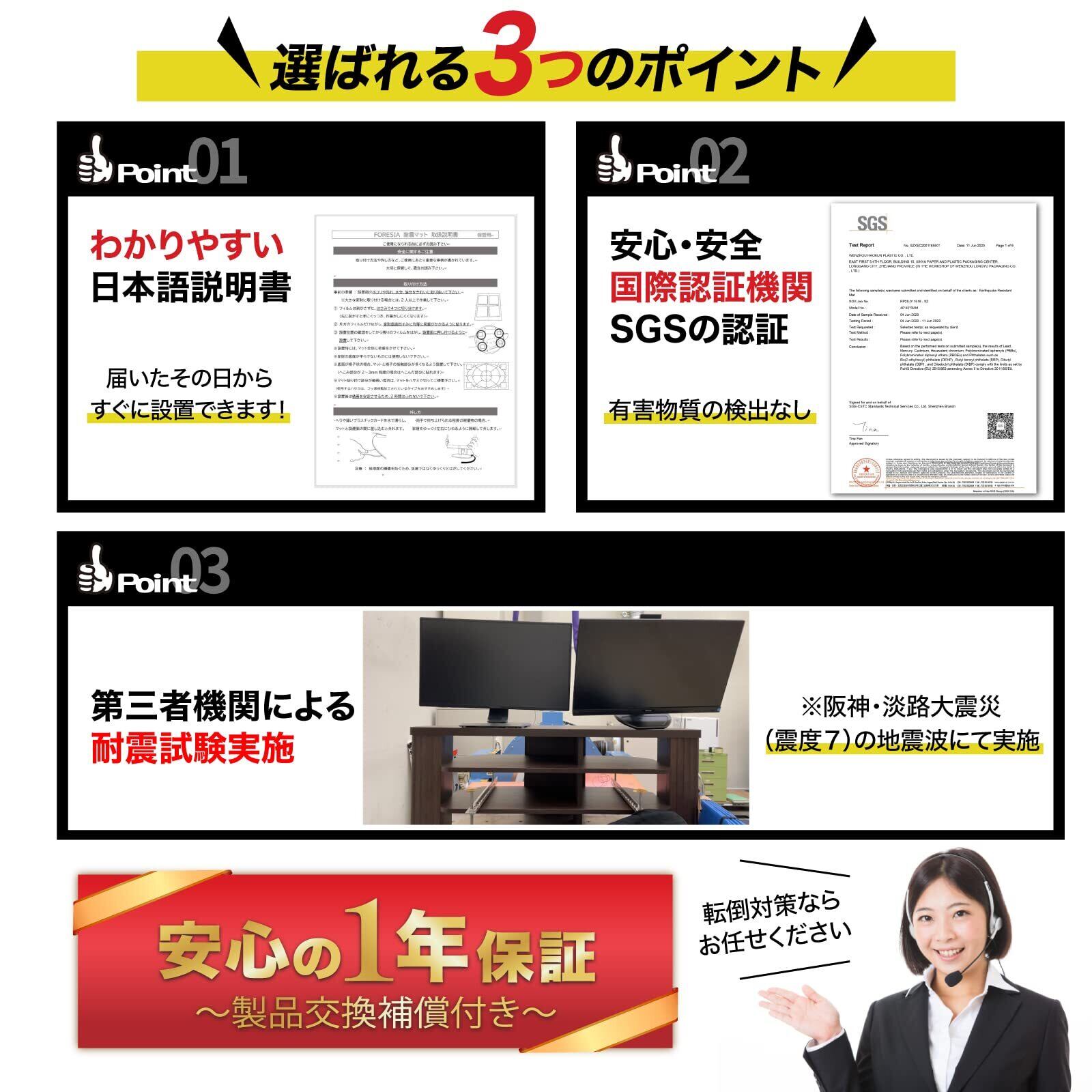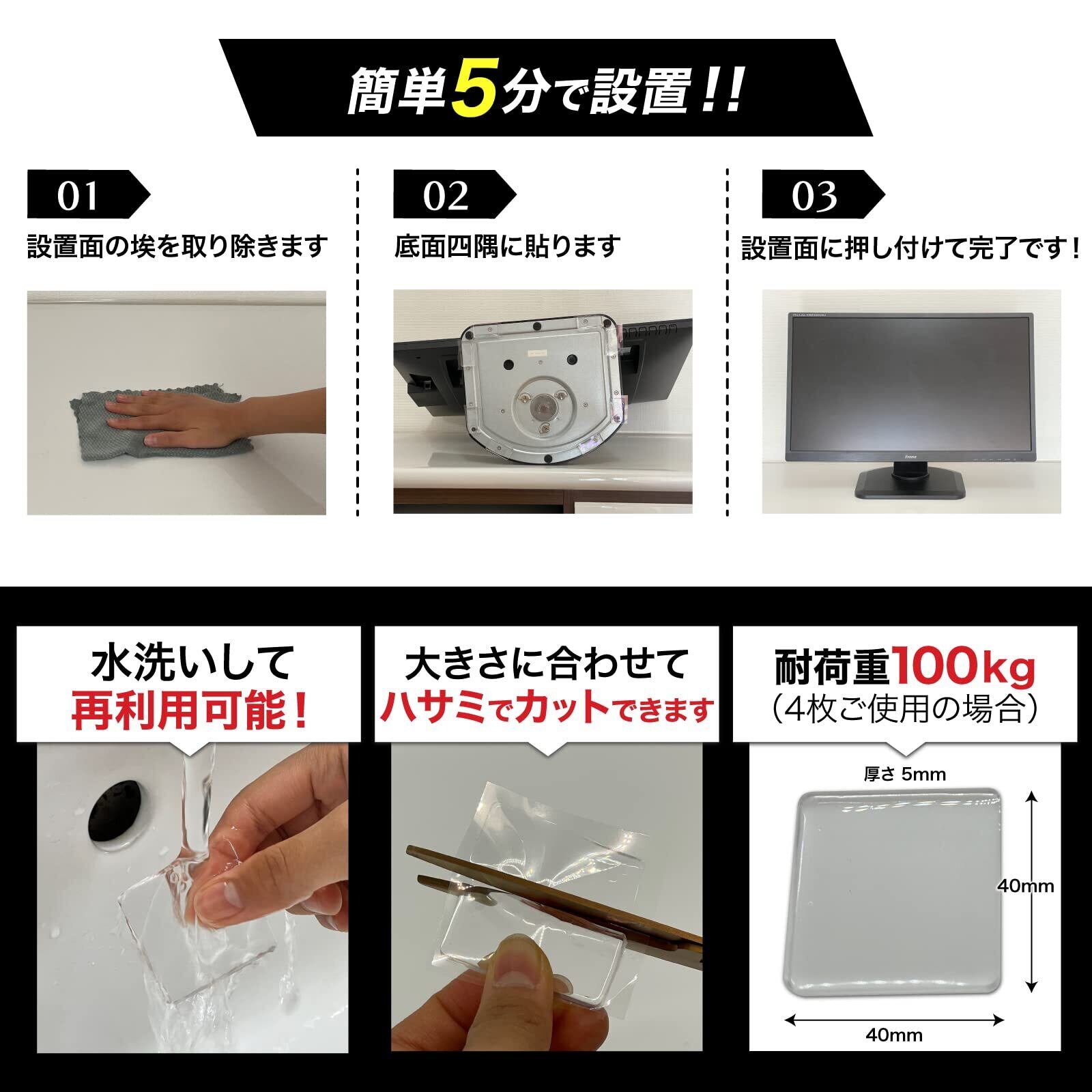 【新開発の耐震マット】驚異の粘着力により、貼るだけで転倒対策ができます。賃貸住宅で穴を開けられない場合でも、工事不要で設置することが可能です。厚さ5mmで耐荷重100kg(4枚ご使用時)の耐震ジェルです。子供やペットのいたずらによる、転倒防止にも役立ちます。