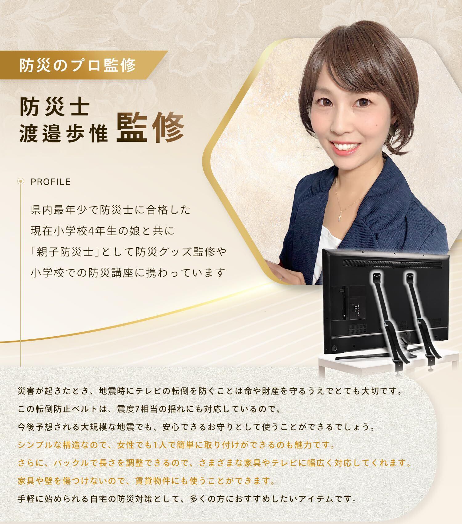 【現役防災士が監修したテレビ転倒防止ベルト】この転倒防止ベルトは、震度7相当の揺れにも対応しているので、 今後予想される大規模な地震でも、安心できるお守りとして使うことができます。 シンプルな構造なので、女性でも1人で簡単に取り付けができるのも魅力です。 さらに、バックルで長さを調整できるので、さまざまな家具やテレビに幅広く対応してくれます。家具や壁を傷つけないので、賃貸物件にも使うことができます。 手軽に始められる自宅の防災対策として、多くの方におすすめしたい震対策アイテムです。