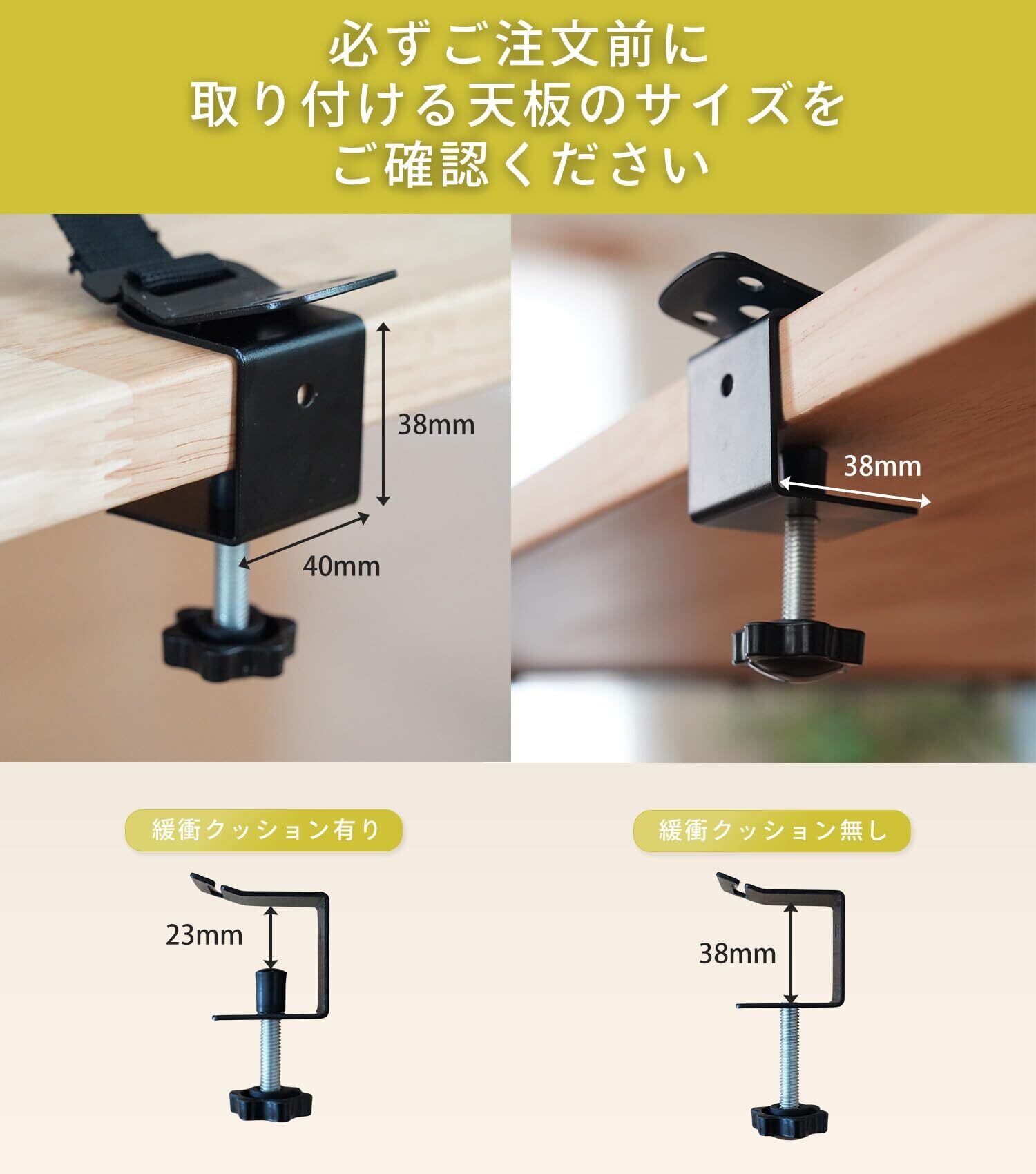 【厚さ38mmまで対応壁にも取り付け可能】緩衝材を外せば厚さ38mmまでの天板に対応。クランプを天板に挟んで固定するだけだから設置も簡単。様々な天板にご使用いただけます