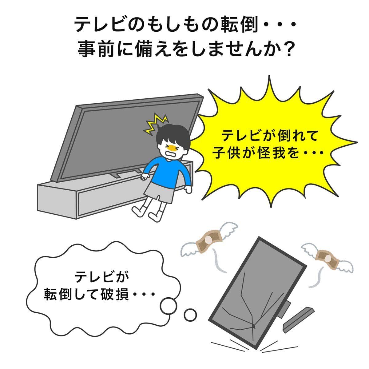 【テレビ てんとう防止ベルト】液晶TVと天板付きのTVラックを固定することで、地震などによる液晶TVの転倒を防ぎ、落下によるケガを防止する転倒防止ベルト。小さなお子様のいる家庭では、お子様による転倒アクシデントの防止にも役立ちます。また、転倒による故障や買い替えの出費を防ぐことができます。