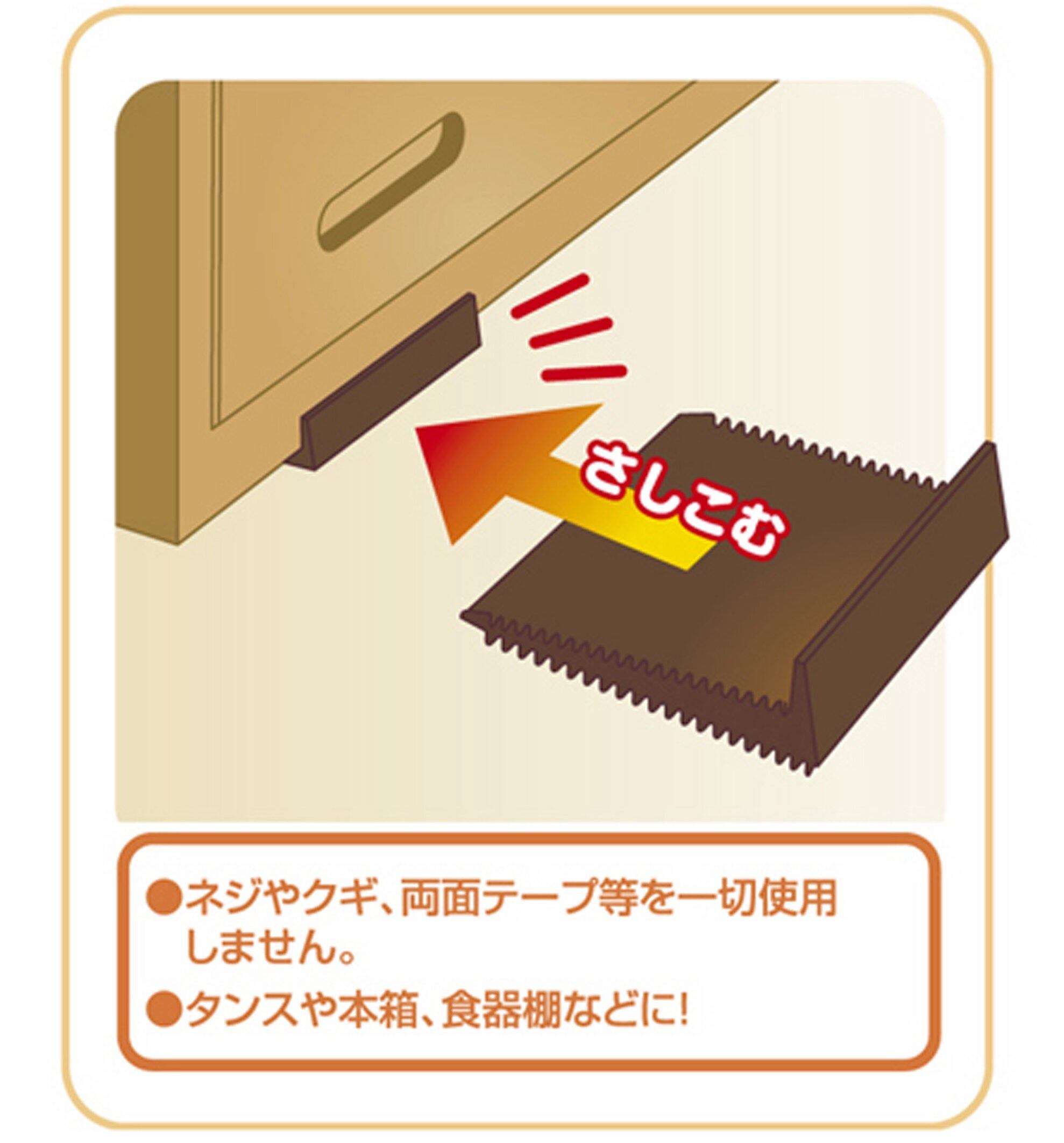 たんすや食器棚などの家具に設置することにより、滑り出しを防ぎ、転倒しにくくしてくれる耐震ストッパー