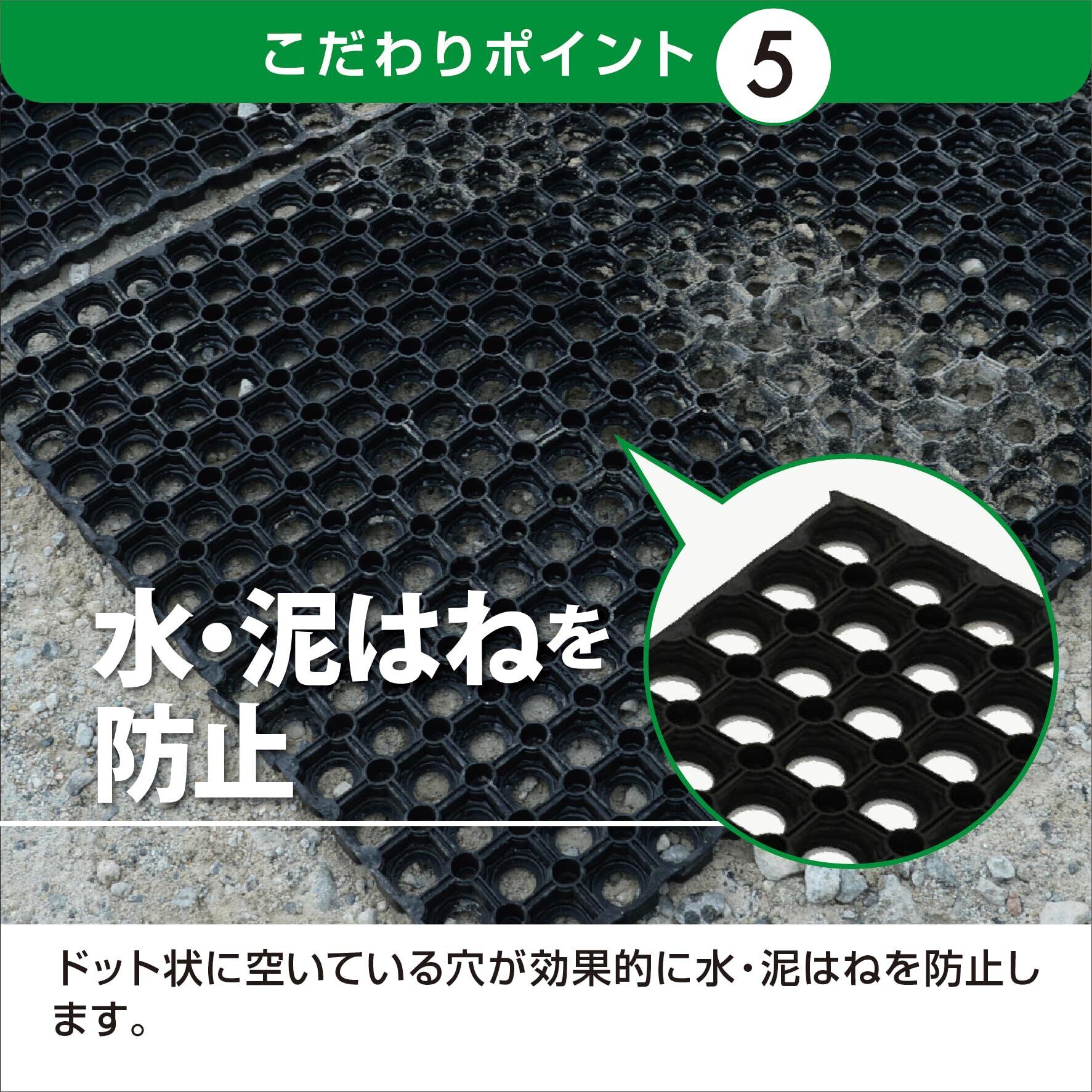 • 優れた耐久性:再生ゴムを使用していないため、一般的なラバーマットと違い、長期間使っても硬化しにくい。また、荷重にも強く、高い反発弾性とクッション性があり足元をしっかりサポート。
