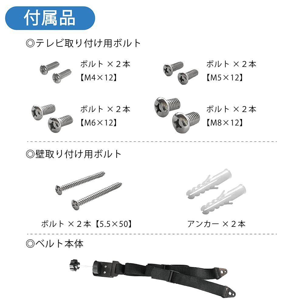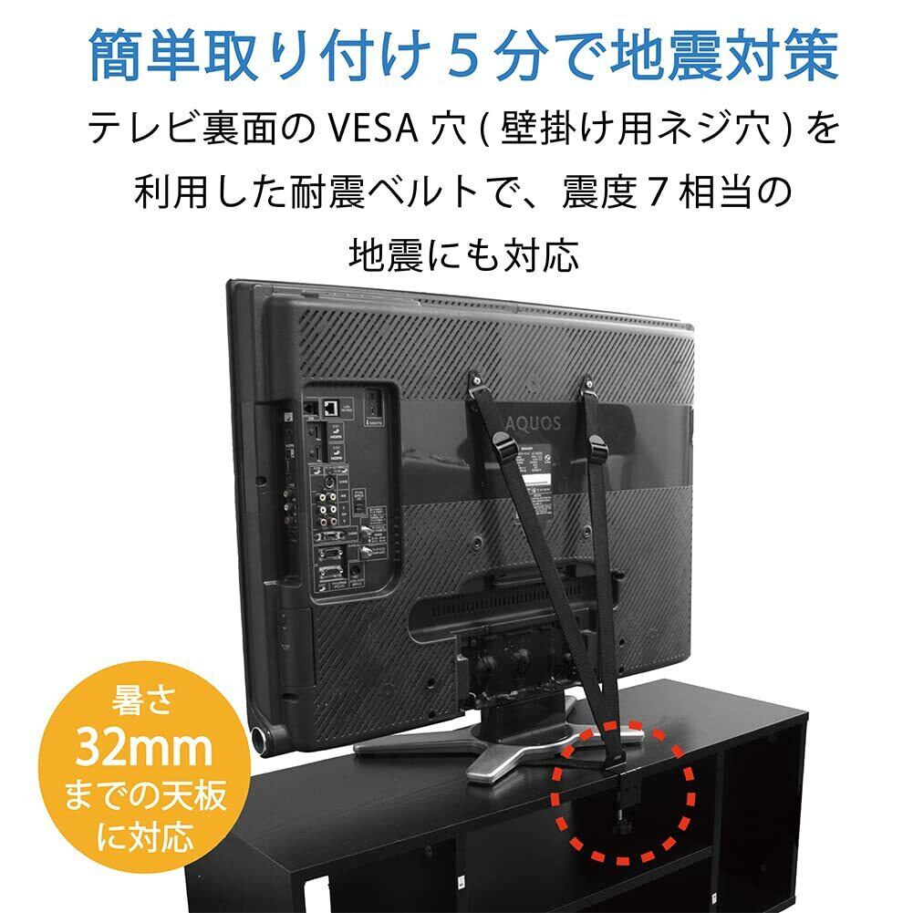 【転倒防止】テレビ背面にあるVESA穴とテレビ台をベルトで固定することで、地震などによる転倒を防ぎ、落下によるケガ、TVの故障を未然に防ぎます。またお子様による転倒防止にもご使用頂けます。