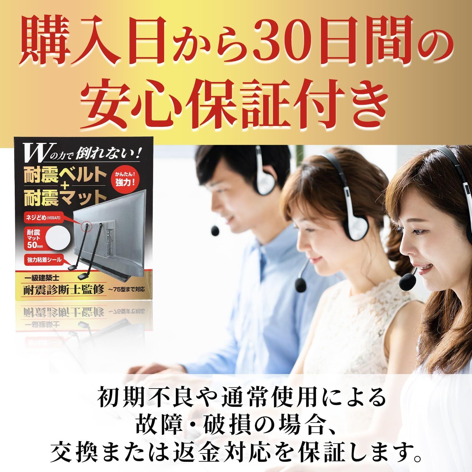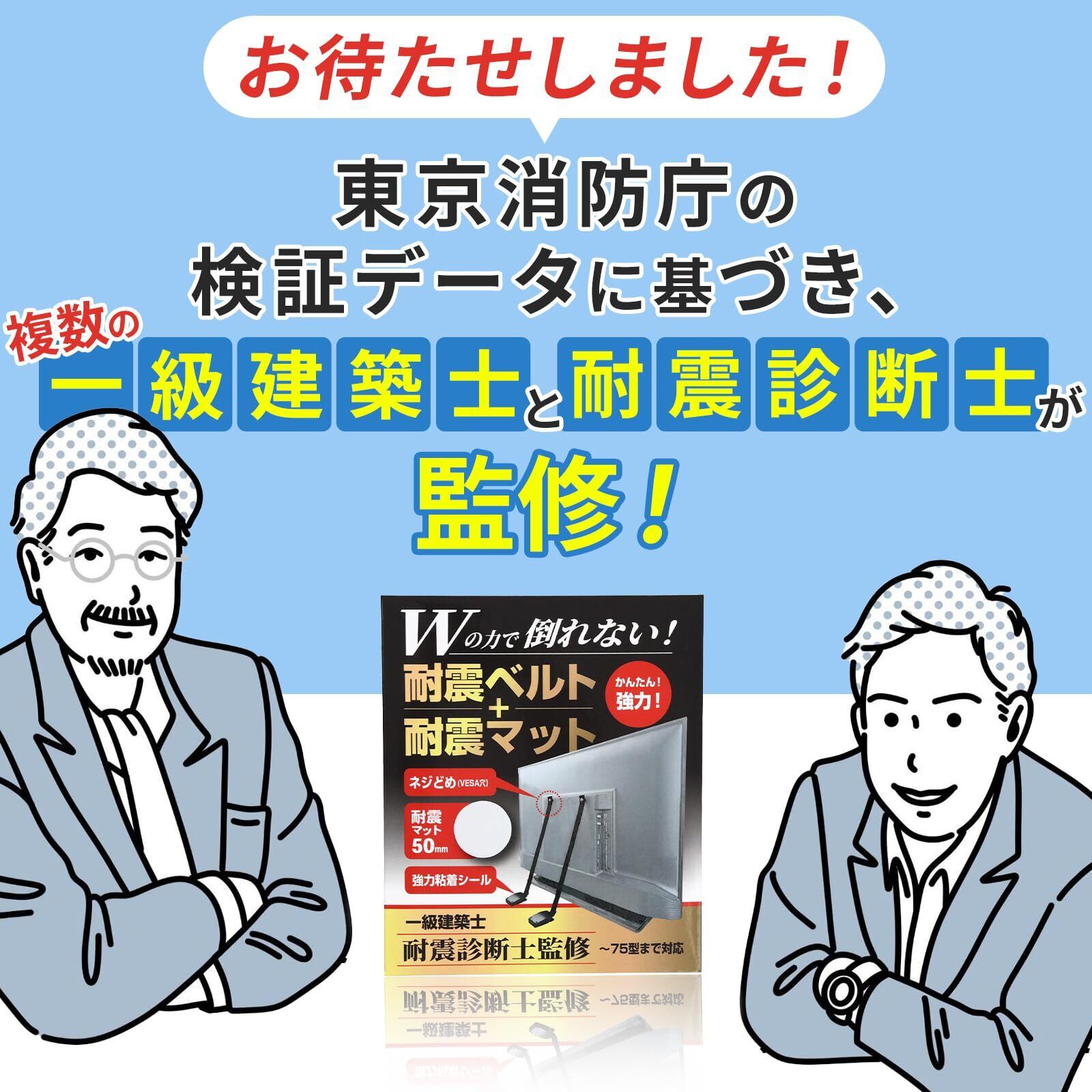 【地震対策の新定番!「Wの力」でテレビを守る】VESA穴に取り付ける耐震ベルトと足元を支える耐震マットで、揺れを分散し転倒リスクを軽減。建築の耐震理論を応用した安心設計です。
