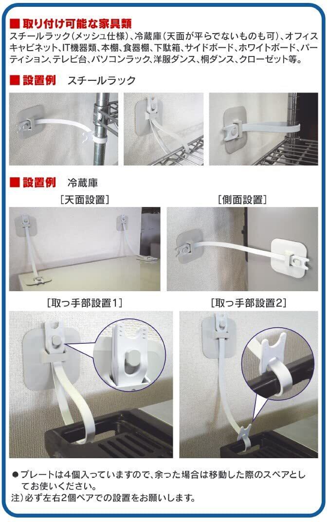 プレートとゴムベルトが地震発生時の移動/転倒を防ぎます。