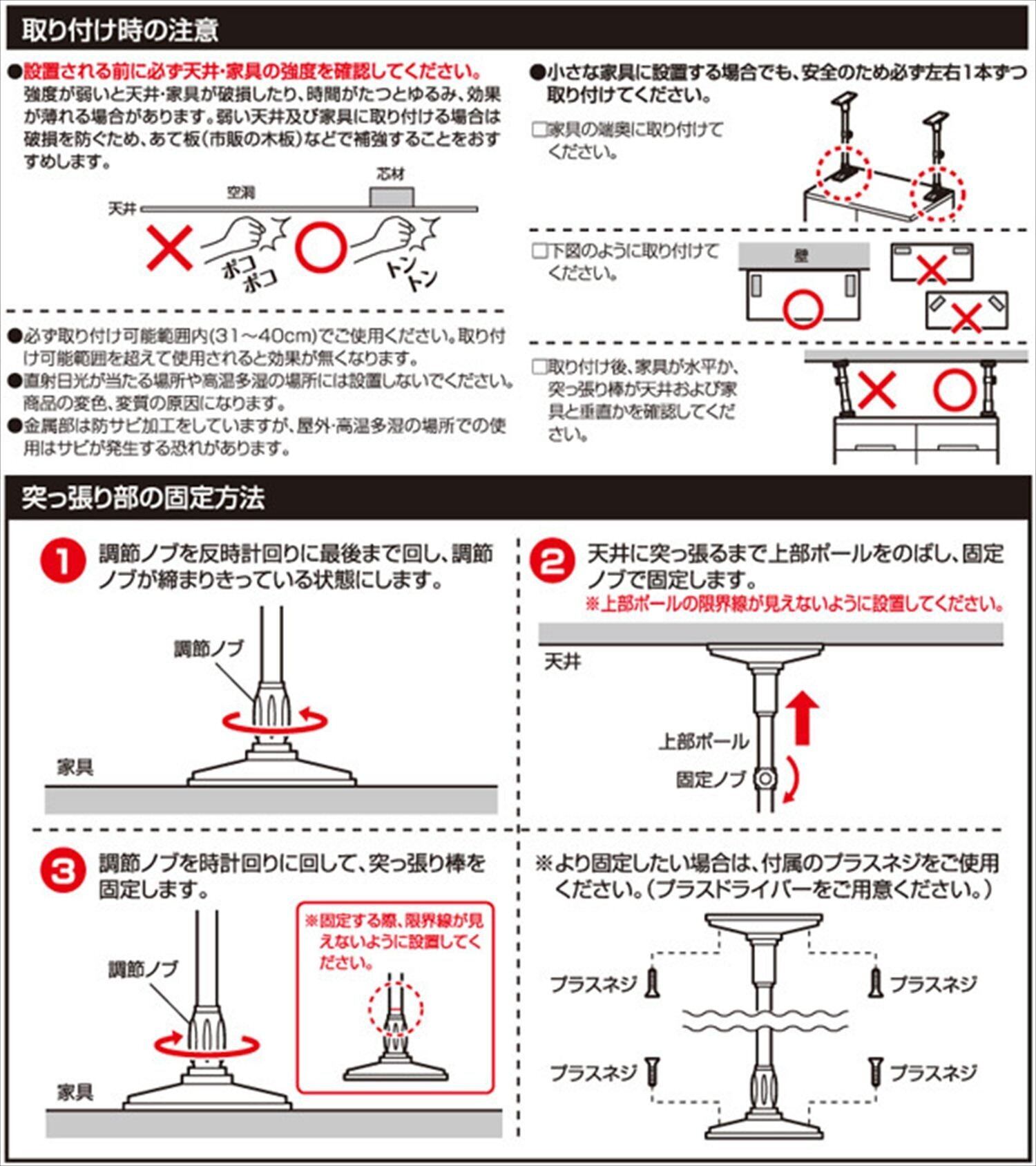 ●上部はバネ入りの特殊パーツで安心構造の突っ張り棒●食器棚、本棚、ご家庭の背の高い家具の転倒防止に大活躍●耐圧荷重:200kg●突っ張りをサポートする大判のすべり止め付属