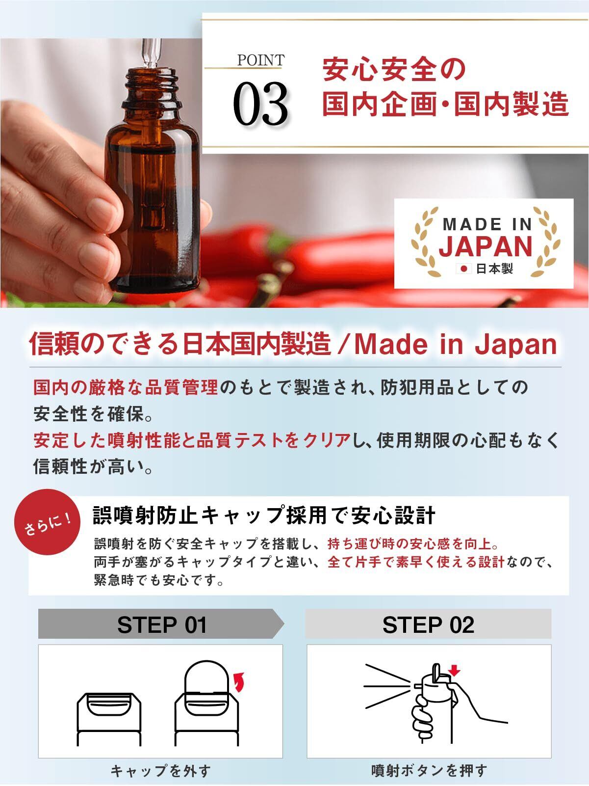 【安全性に配慮した天然成分】主成分には天然唐辛子由来の成分を使用。人体に優しく安全性に配慮しつつ、万が一の状況でも強力な刺激で相手の動きを一時的に抑制します。