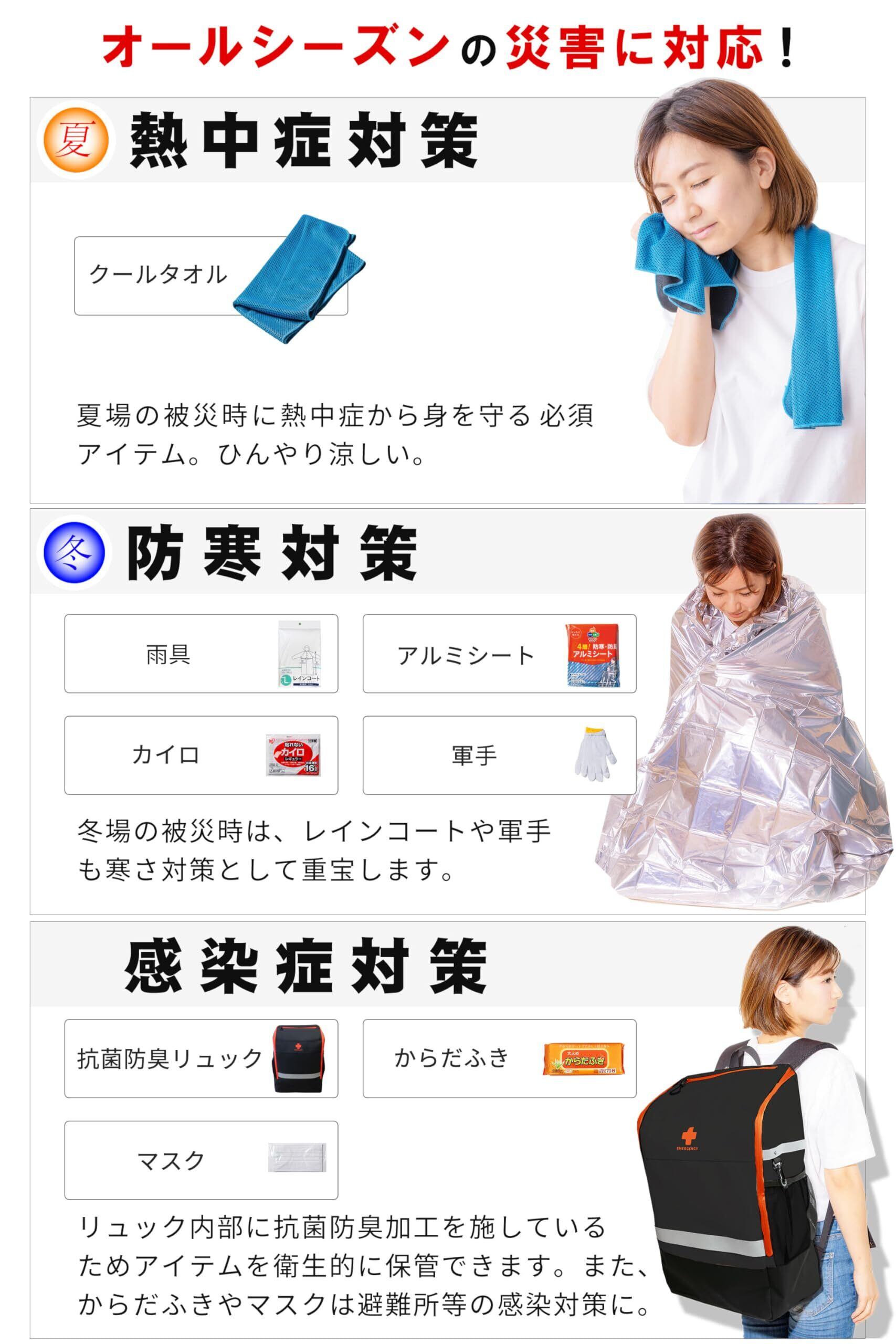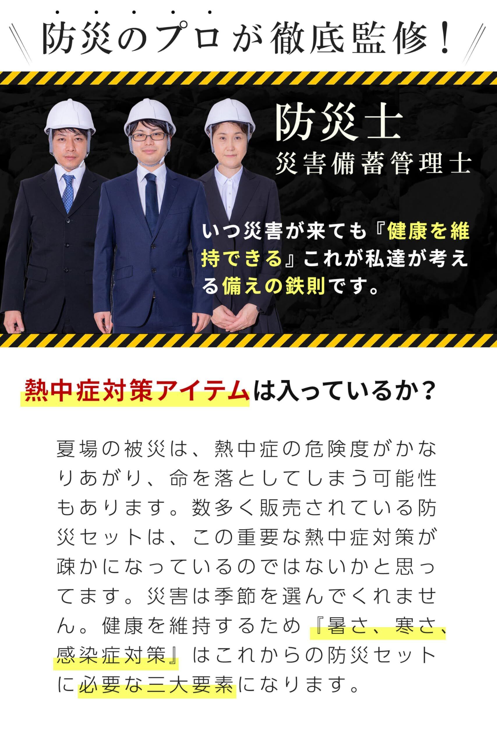 【災害は季節を問わずやって来る!】外にいるだけで身の危険を感じる暑い夏に寒い冬。そんな時にもし災害が起きたら・・・。防災のミカタはあらゆる危機を想定して熱中症対策と寒さ対策の防災グッズを備えてます。身を守るために必要なものを考え抜いた精鋭の防災セット、災害時の避難生活は防災のミカタの非常用持ち出し袋にお任せください。