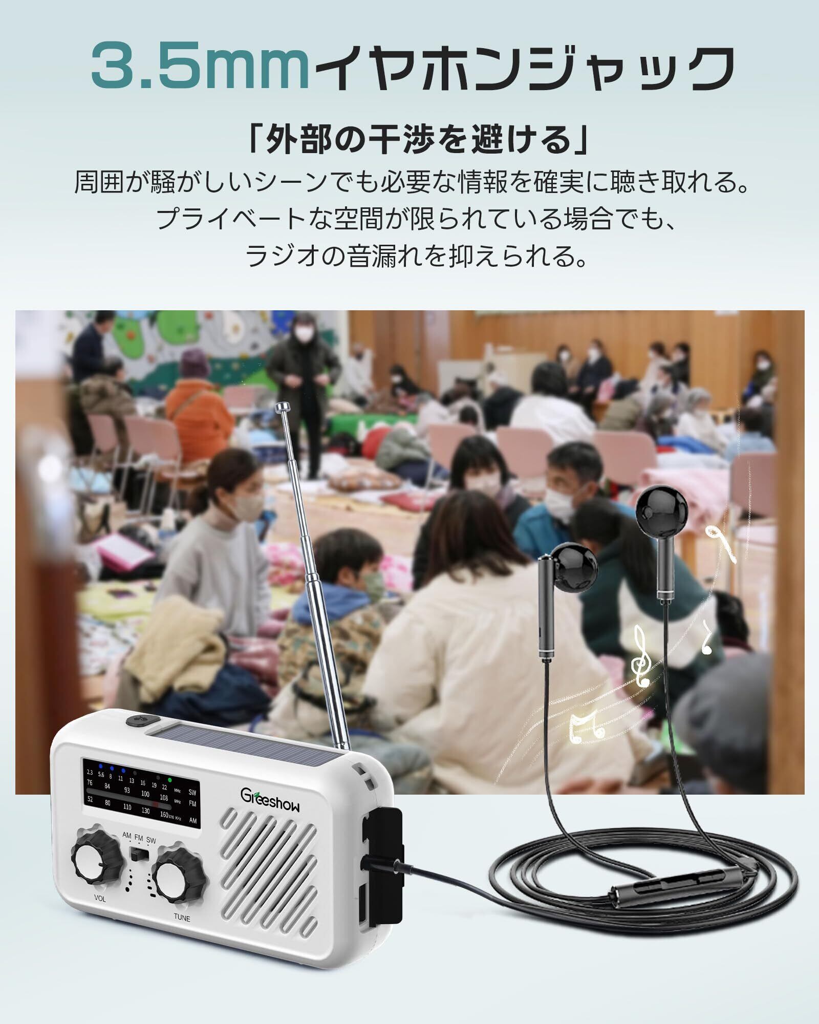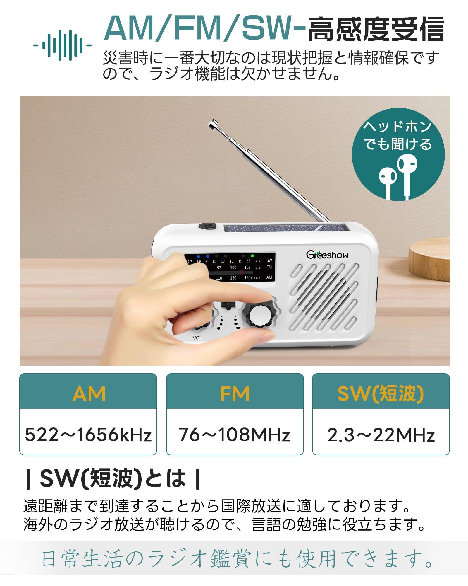 【防災安全協会推奨品認証】Greeshow 防災ラジオ 多機能 携帯ラジオ 手回し充電・ソーラー充電対応 SW/AM/FM受信 LEDライト 手回しラジオ(FM:76-108MHz) SOSアラート スマホ充電 3.5mmイヤホン対応 2000mAh 防水 小型 USB充電 懐中電灯 防災グッズ 地震 台風 緊急対策 日本語説明書付 GS-297(ホワイト)