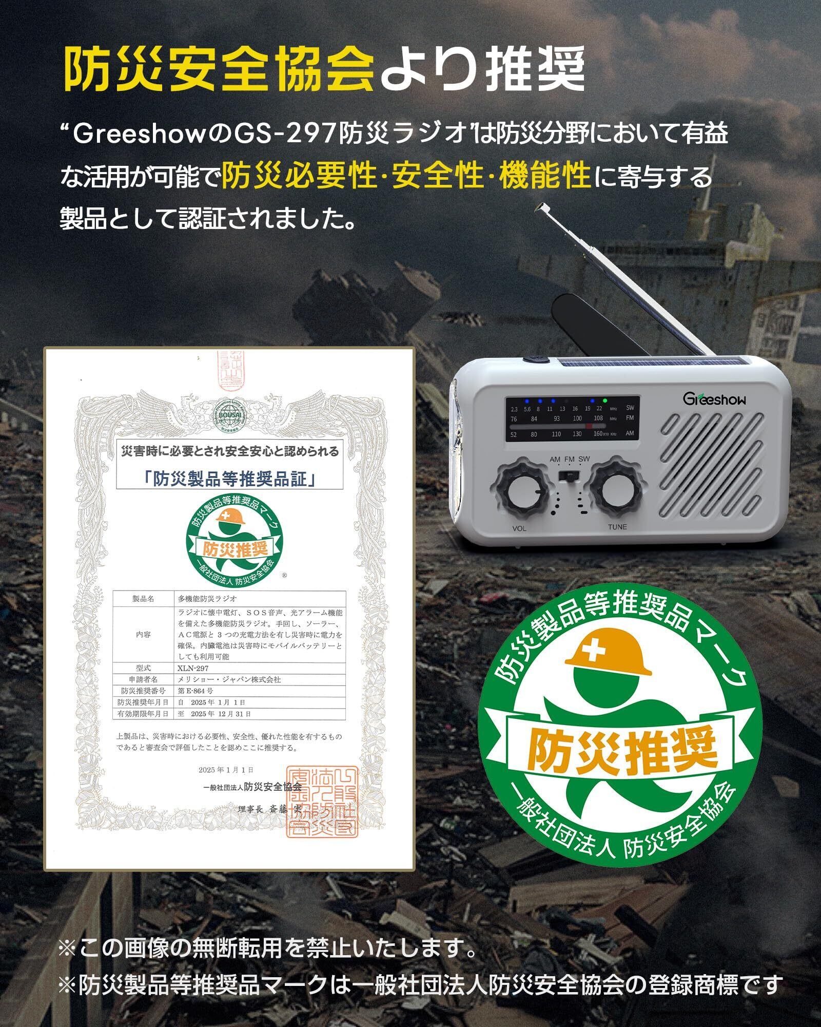 【防災安全協会推奨品認証】 Greeshow 防災ラジオ 多機能 携帯ラジオ SW/AM/FM 手回しラジオ (FM周波数76Mhz-108MHz) SOSアラート付き ソーラー充電 災害ラジオ 小型 防水 3.5mmイヤホンジャック付き 2000mAhバッテリ キャンプ 緊急用 非常用 USB充電 スマホ充電可能 LEDライト PSE技術適合 防災ガイドブック付き GS-297