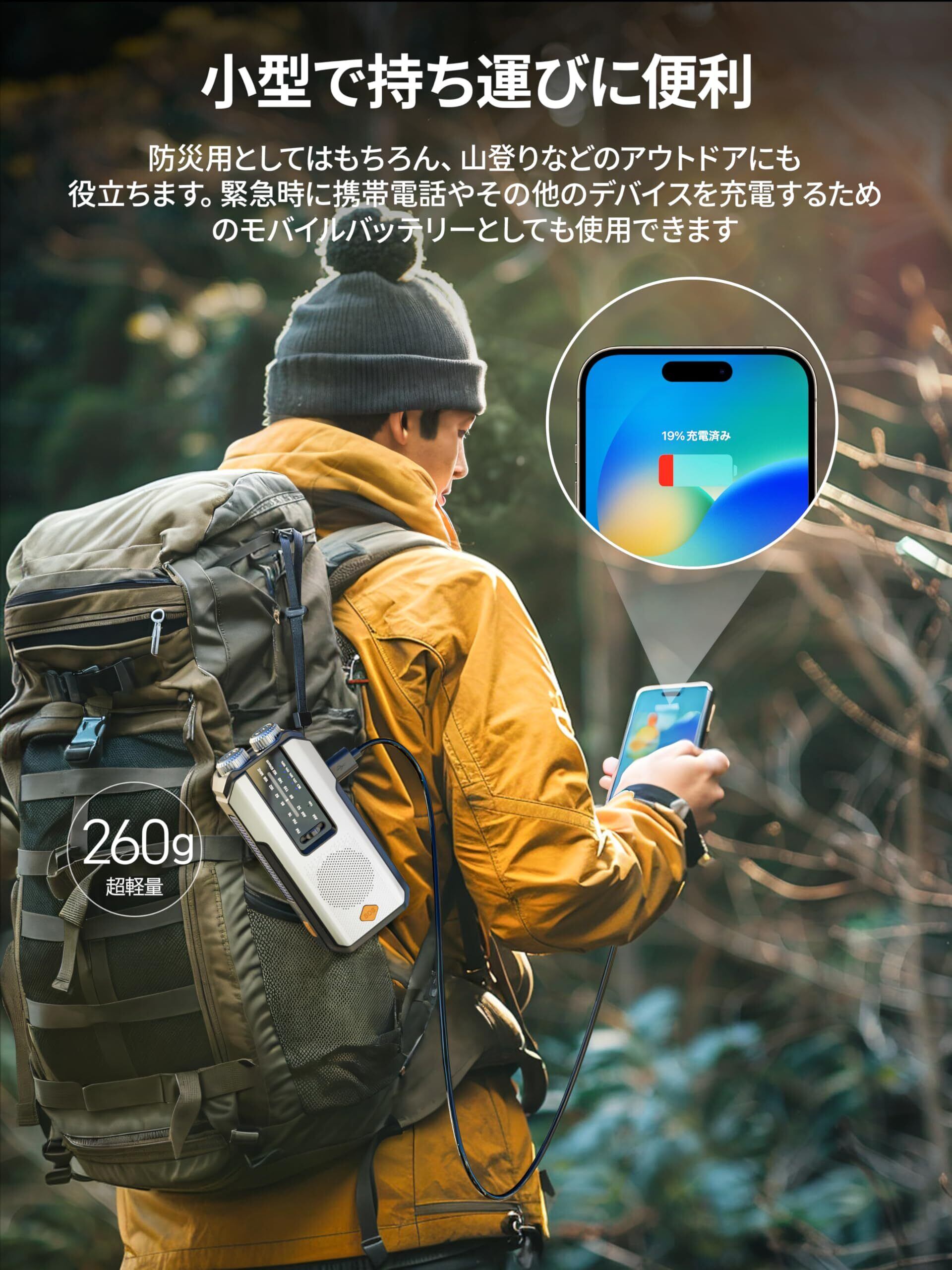 【モバイル充電&幅広い用途】防水規格に準拠しており、雨の日でも使えます。緊急時にモバイルバッテリーとしてスマホを充電することが可能です。大容量2500mAhバッテリーを内蔵して、iPhone、Android、各種スマートフォンへの充電に対応しています。入力端子はUSB Type-C、出力端子は USB Micro-Bです。適用場所:お釣り、災害時の情報収集用、散歩、旅行、山登りなどのお伴にどうぞ。梱包内容:ラジオ本体、Type-C 充電ケーブル、日本語取扱説明書、ストラップ。安心の1年がついております。商品の故障や不具合など、お客様の困りごとにも迅速に対応致します。お気軽にお問い合わせくださいませ。