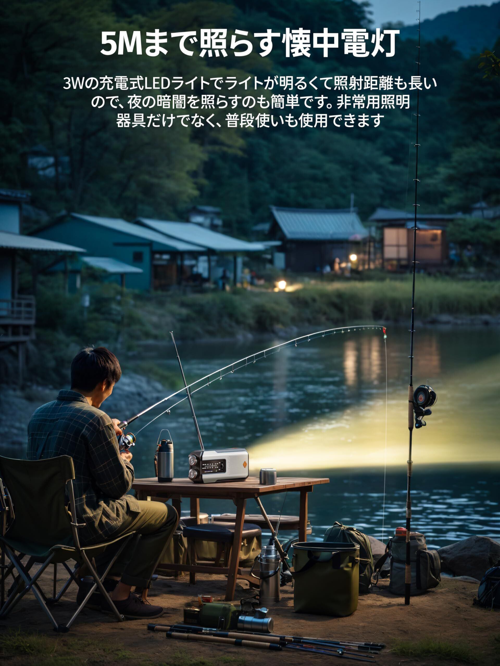 【多機能防災ラジオ&懐中電灯】大型の選局ダイヤルを採用しています。誤操作を防止するため、AM/FMの切り替えダイヤルも大きめに設計します。防災ラジオとして使用するだけでなく、災害時に役立つ付属機能がついて、もしものときにも活躍します。ライト付きて、災害時に停電が起こったときや、夜間に避難所などへ移動するときに役立ちます。5Mまで広い範囲を強い光で照らせて、周囲の安全を素早く確認可能です。懐中電灯を探しに行く手間が省け、暗い室内を移動するリスクも抑えられます。懐中電灯を別で持ち歩く必要がない分、防災グッズを減らせるのもポイントです。