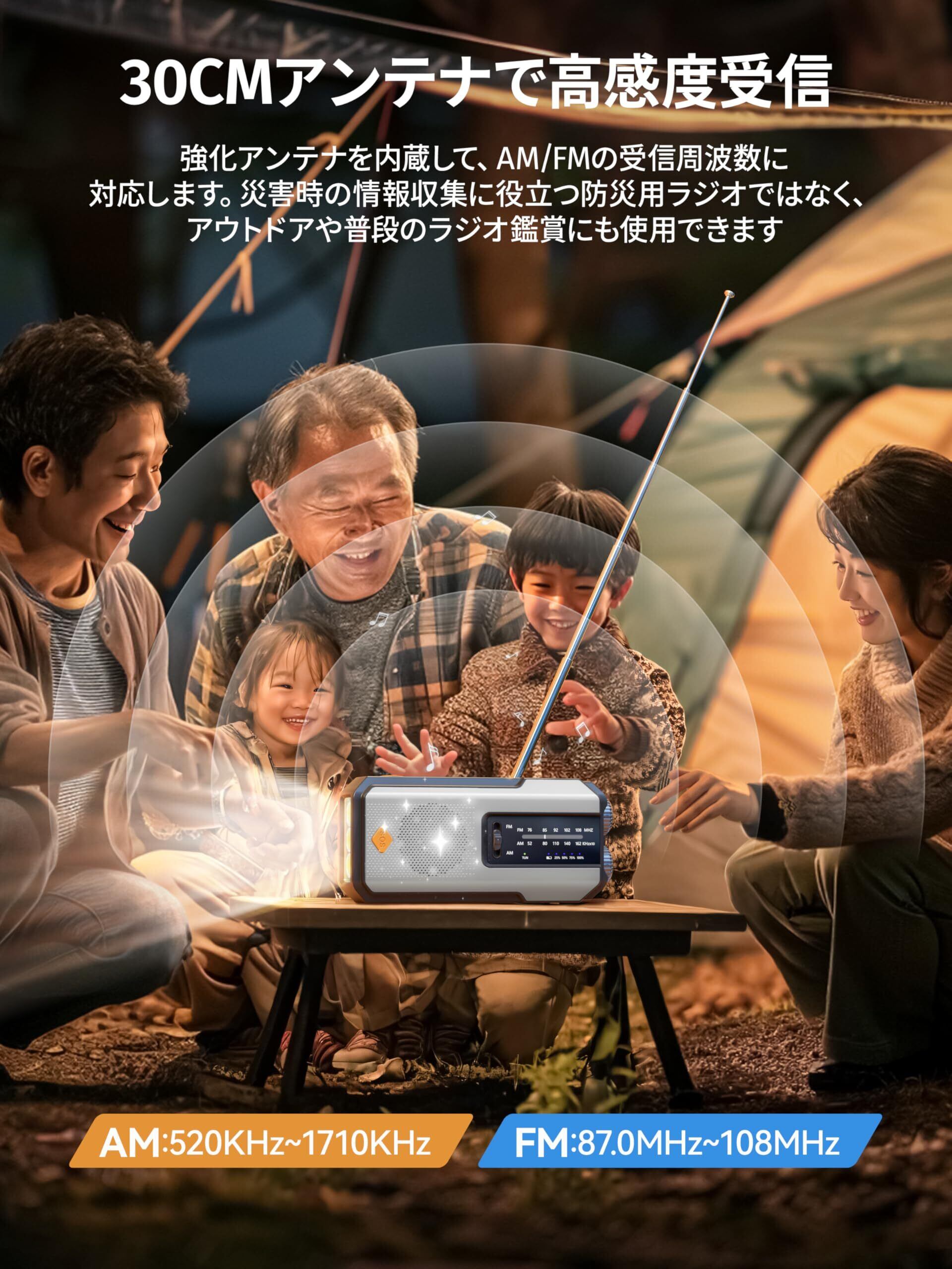 【AM/FMラジオ &高感度受信】台風や地震などの災害時に情報収集するのに役立つ防災ラジオです。FMの電波でAMの放送を聴くことが可能です。30cm伸縮アンテナを搭載しております、抜群な受信感度を実現できます。アンテナが高所に設置されているため、津波などによる影響が抑えられています。また、マンションや山間部でも雑音の影響を受けにくく便利です。AM(520-1710kHz)およびFM(76-108MHz)の受信周波数に対応しています。