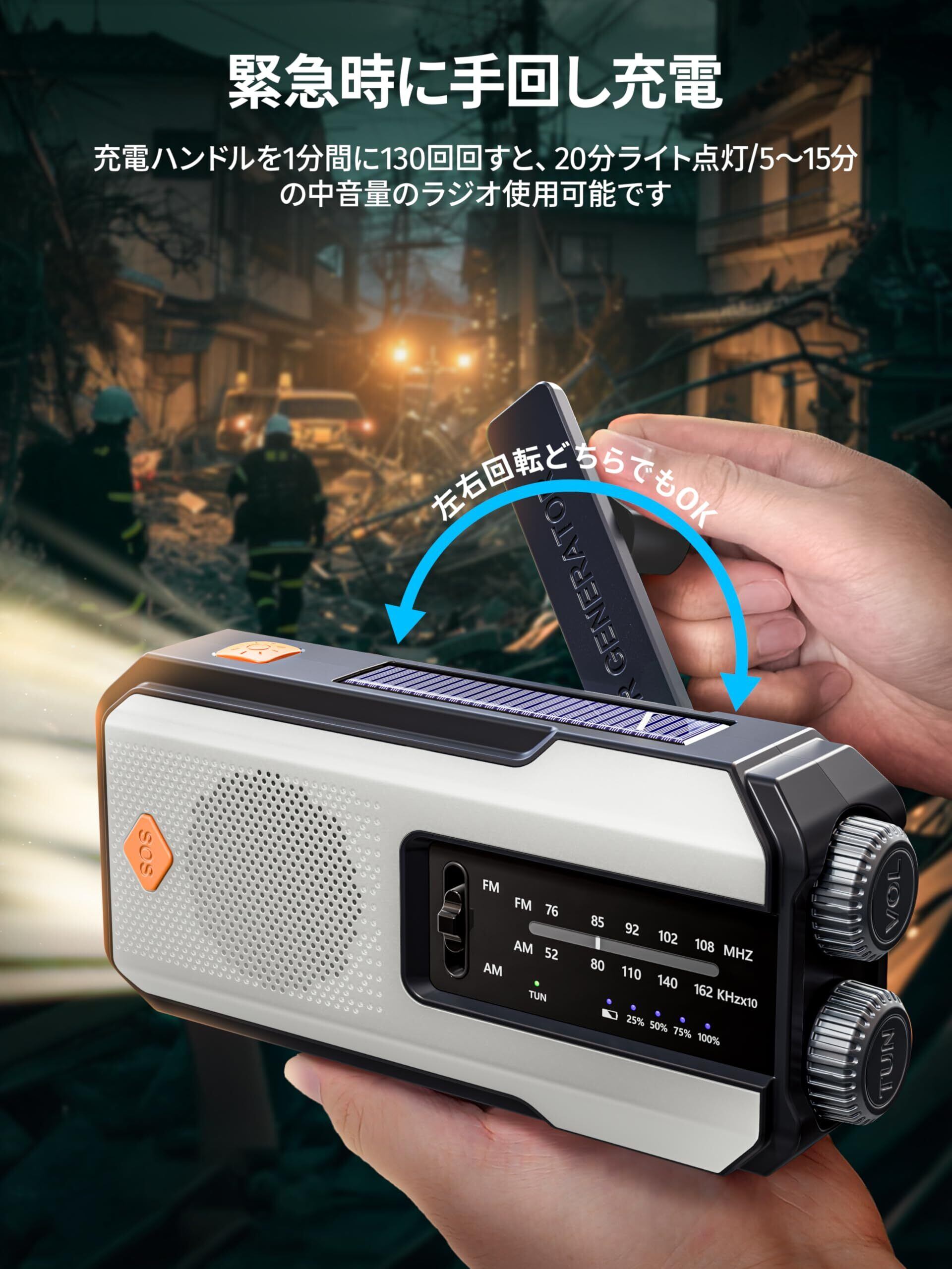 【緊急時に便利な3WAY充電】充電式ラジオは、電力の供給が絶たれたときに手回しやソーラー充電で使用できるため、非常時にも便利です。付属Type-C ケーブルで携帯ラジオも充電できます。(注:ACアダプターは別売り)1回満充電して、最大180日の長期間待機可能です。手回し充電に使うハンドルは本体と一体になっているので、携帯性にも優れています。手回しハンドルを1分間に130回回せば約15分間ラジオを聞けます。20分ライト点灯します。