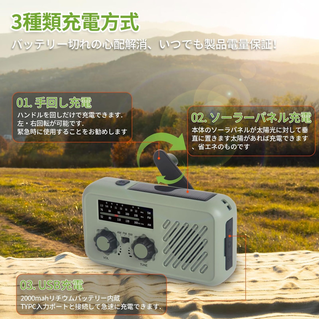 【3種類充電方式、2000mah充電バッテリー】災害時の充電も安心です!充電方式が多様で、手回しで充電、USB充電、内蔵充電電池が付き!電力を気にしないでください、使おうとしたら、充電ができませんの心配解消!日常用と防災用ラジオをとして必要なアイテムです。2000mAh大容量バッテリー付き、災害などの緊急時にもモバイルバッテリーとしてスマホのバッテリーを充電できます。