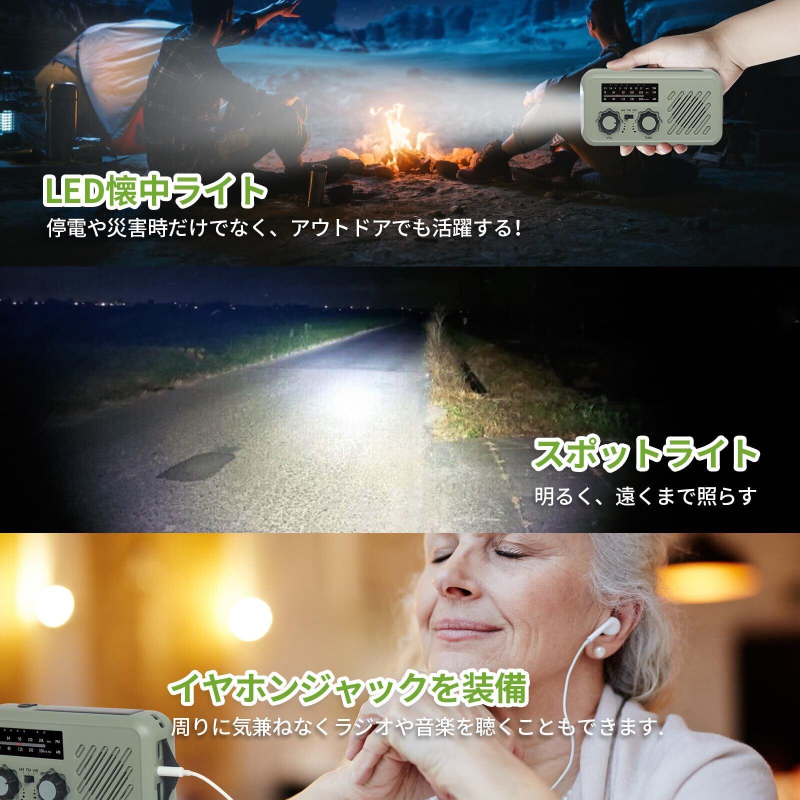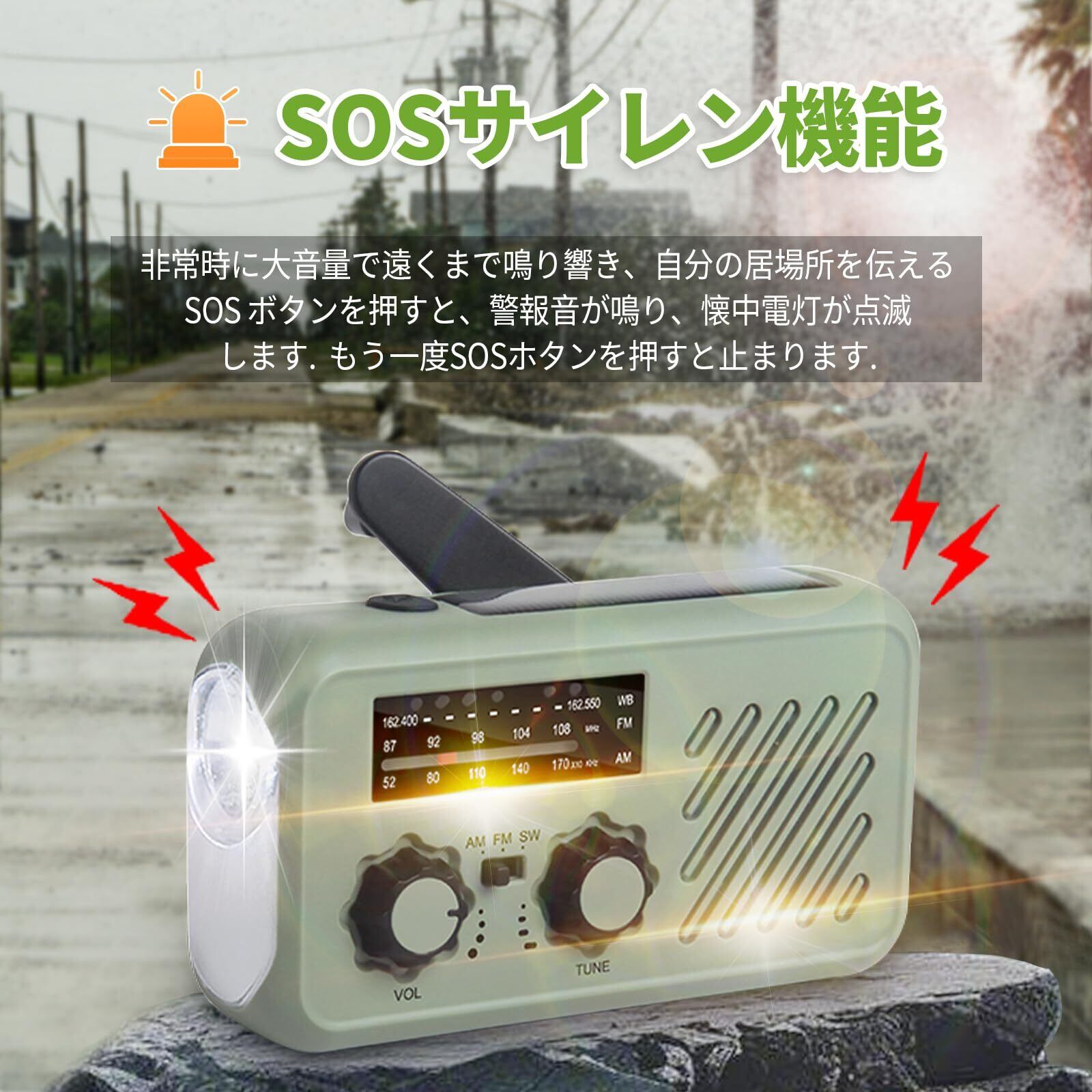 【懐中電灯&スポットライト&SOSサイレン機能】多機能防災ラジオは、災害時や停電時の緊急対応に最適な製品です。夜間や停電時に便利なLEDライトを搭載しています。懐中電灯付きなので、万が一の停電時にも安心です。LEDライトボタンを順次に短く押すたびに、ライトが強点灯→フラッシュ点灯→投光照明→オフの順番に切り替えます.非常時にスイッチを切り替える事により、大音量で周囲に危険を知らせる「SOSサイレン」機能付き。災害で家や車に閉じ込められた時に周囲に助けを求めたり、夜間に散歩や釣りで1人になる時には、防犯ブザー代わりにもなって安心です。